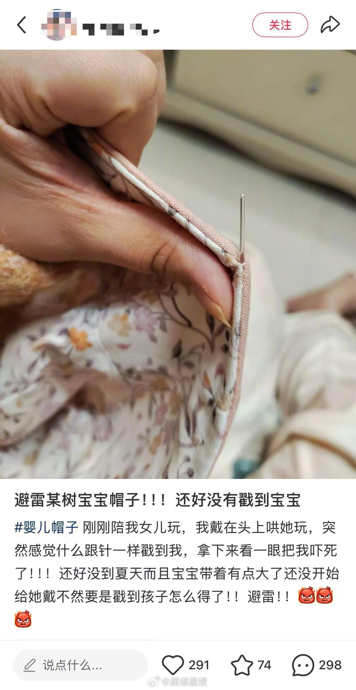 据网友发帖,其称将宝宝遮阳帽戴在自己头上陪1岁女儿玩时,突然感觉有类似针一样戳到自己。“拿下来看一眼把我吓死了!还好没到夏天而且宝宝戴着有点大了,还没开始给她戴,不然要是戳到孩子怎么得了。”在其评论区,其补充称,遮阳帽品牌是KK树,没洗过,也没给宝宝戴过,就是顶在自己头上哄她笑一下,这么轻易就戳出来了。其提供的图片显示,遮阳帽帽圈露出一截。