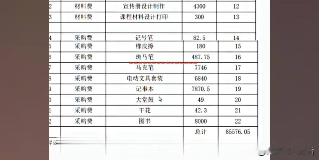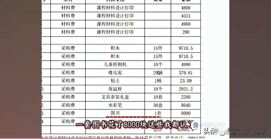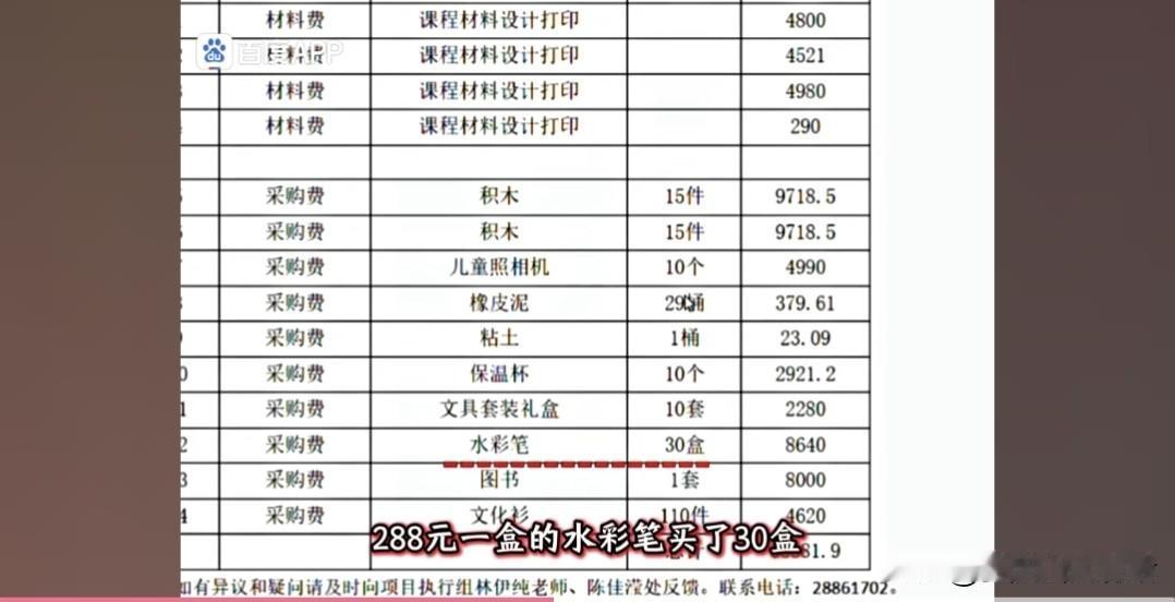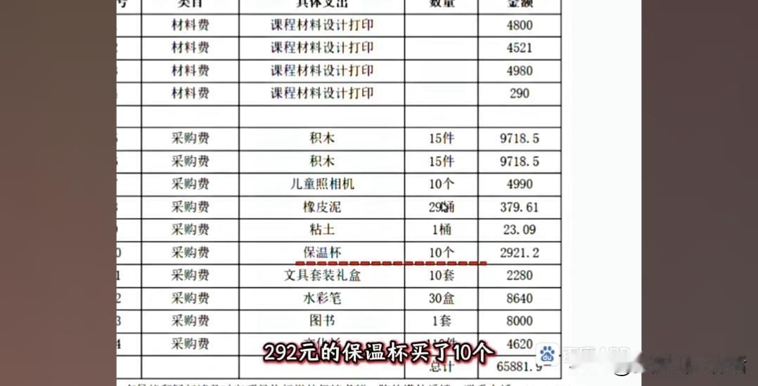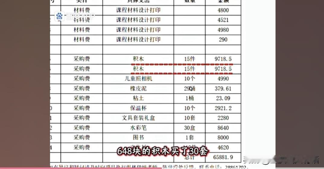 咱们来看看这“花在孩子身上”的钱都买了啥:3个书柜15万,288元一盒的水彩笔买30盒,648元的积木买30套,292元的保温杯买10个,一套图书直接花8000块。行,就算你们想给孩子用最好的,咱先忍了!可接下来的明细,简直让人笑掉大牙又气到发抖:82.5支记号笔、487.75支斑马笔、7870.5个记事本——买半支笔我还能勉强理解,0.75支笔是怎么回事?难不成是把一支笔拆成四份卖?
