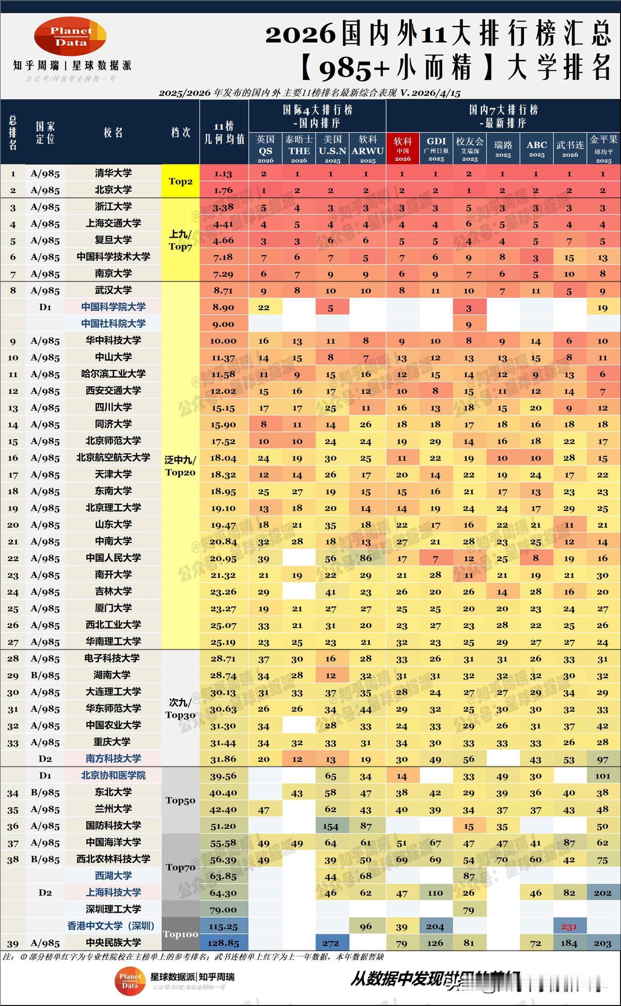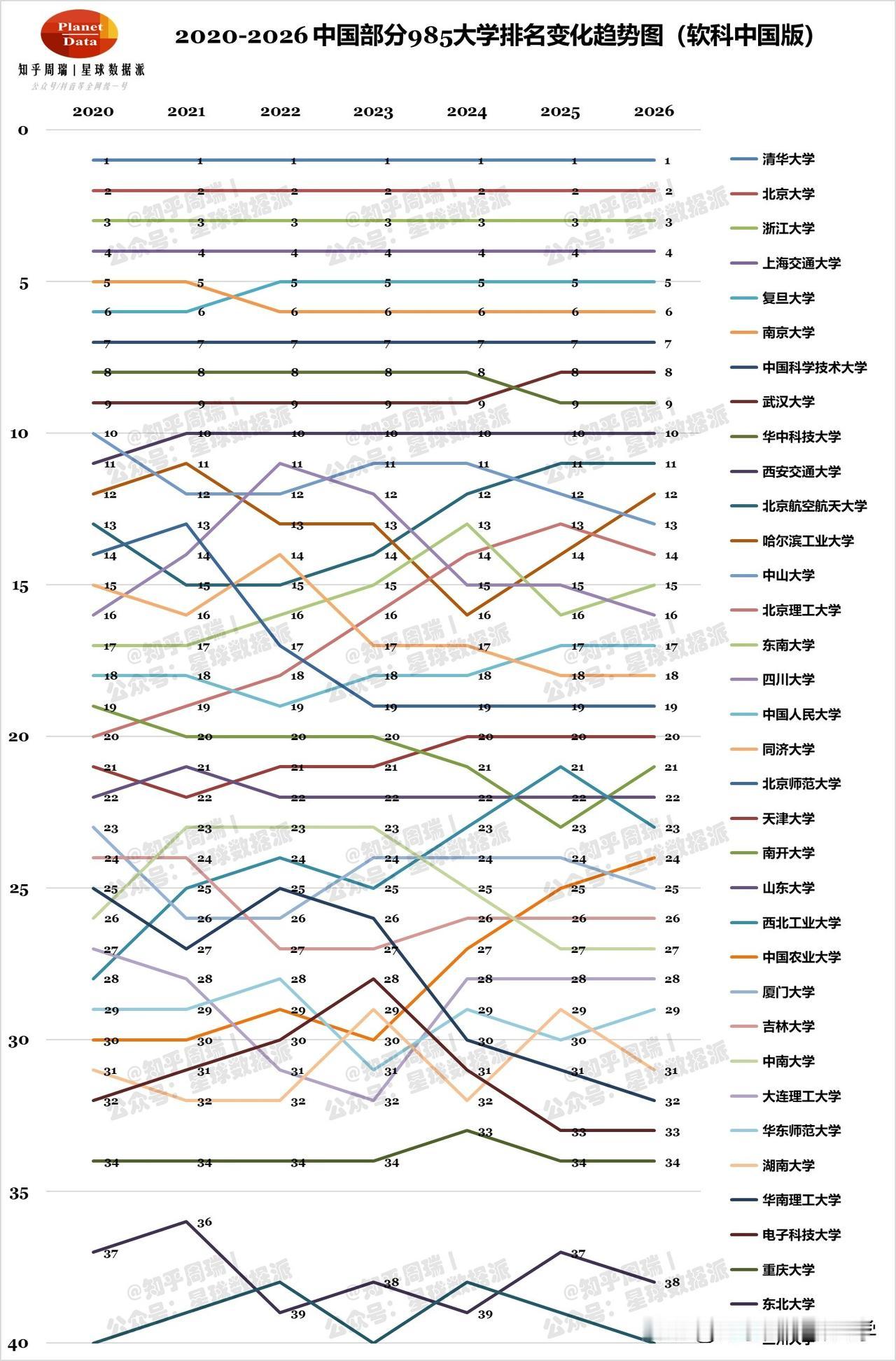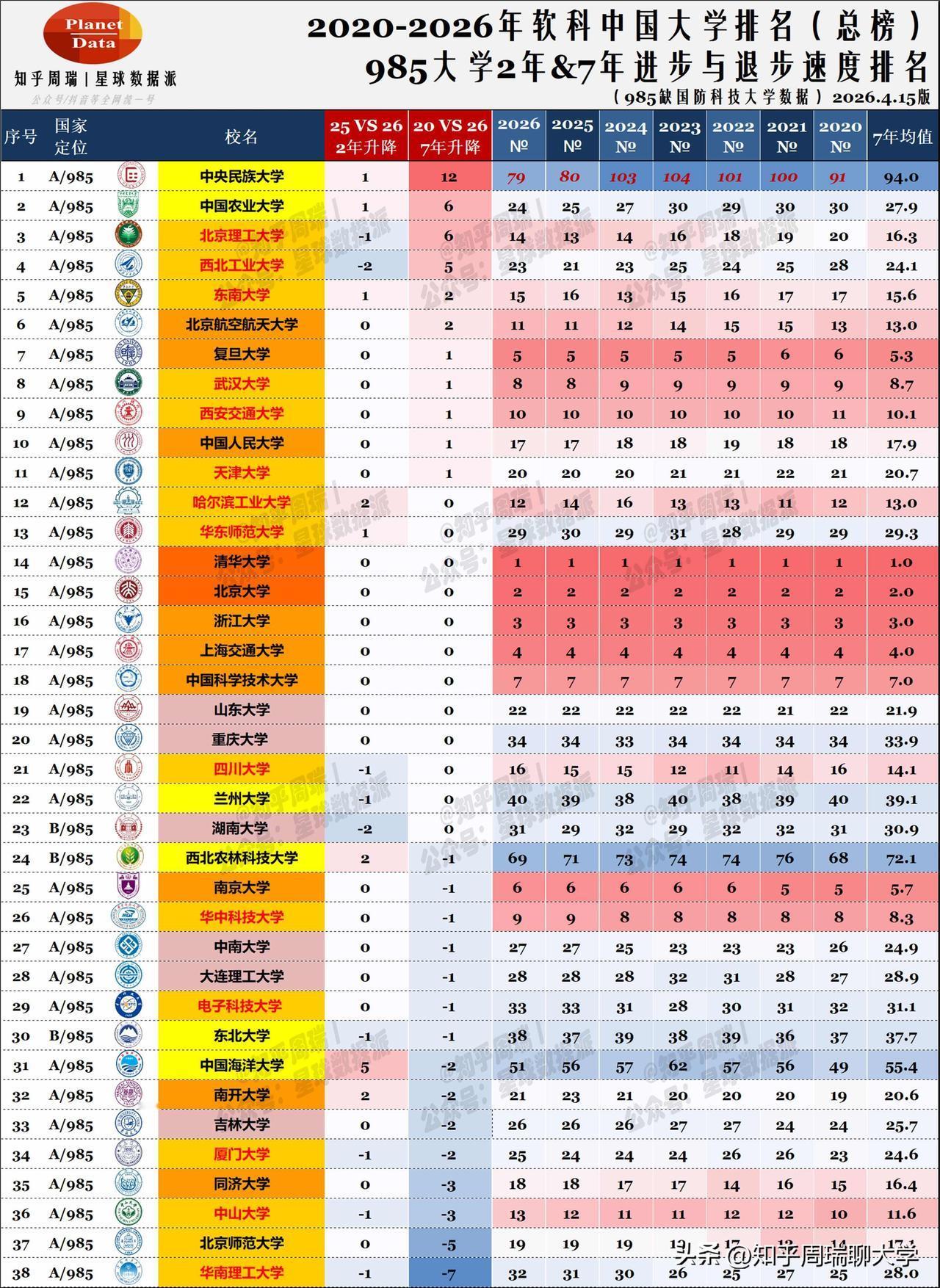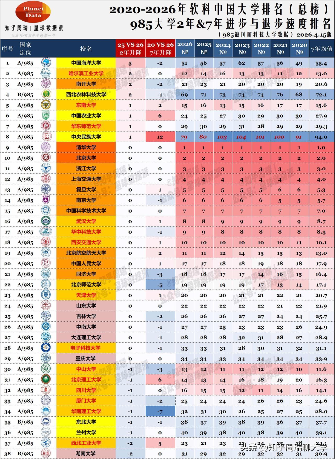 从2020-2026近7年排名看,华南理工退步7名幅度最大,中央民族大学进步12名幅度最大;从2025-2026两年看,中国海洋大学进步5名幅度最大,湖大退步2名幅度最大!