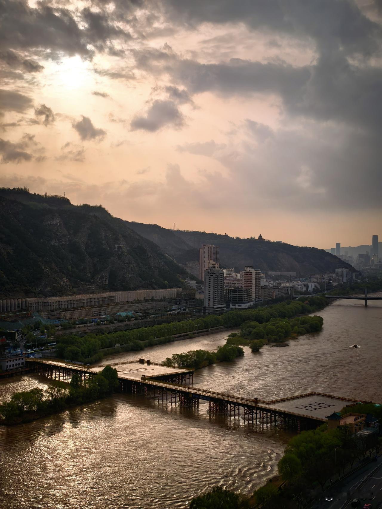 星光随笔 昨夜的雨,为金城洗去了浮尘,也为黄河换上了一身温润的光泽。天光初醒,云层仍带着未散的潮气,却拦不住朝阳的光,从云隙里漏下来,在河面上织成碎金的网。黄河水裹着泥沙奔涌,不再是平日的浊黄,倒像揉了万千星光,随着水波起伏,晃得人眼都软了。岸边的草木被雨水浸得格外鲜亮,深绿的影子映在水里,和波光缠在一起。远山还笼着淡淡的水汽,像蒙了一层薄纱,轮廓在晨雾里柔和了许多。高楼静静立着,看河水穿城而过,看游船剪开金波,留下两道长长的水痕,像给河面系上了银色的丝带。旧桥的木架浸在水里,被晨光镀上暖边,成了这幅画里最温柔的一笔。风里还带着雨后的清润,混着河水的气息,漫过栏杆,漫过窗棂。这是金城的晨曲,没有喧嚣,只有水流的轻响,和阳光落在心上的温柔。雨停了,光来了,日子也跟着亮堂起来了。黄河兰州段风景 兰州小记