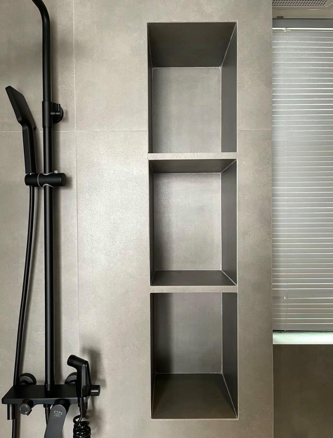 阳角处瓷砖必须45度倒角拼接,缝隙均匀无毛刺!有些师傅偷懒用阳角条,丑得像贴了膏药,还容易积灰发黑!