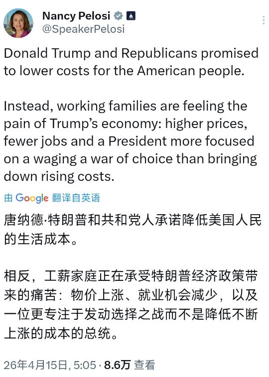 美国前众议长佩洛西(北京时间4月15日)发文写道:“唐纳德·特朗普和共和党人承诺降低美国人民的生活成本。相反,工薪家庭正在承受特朗普经济政策带来的痛苦:物价上涨,就业机会减少,以及一位更专注于发动选择之战而不是降低不断上涨的成本的总统。”
