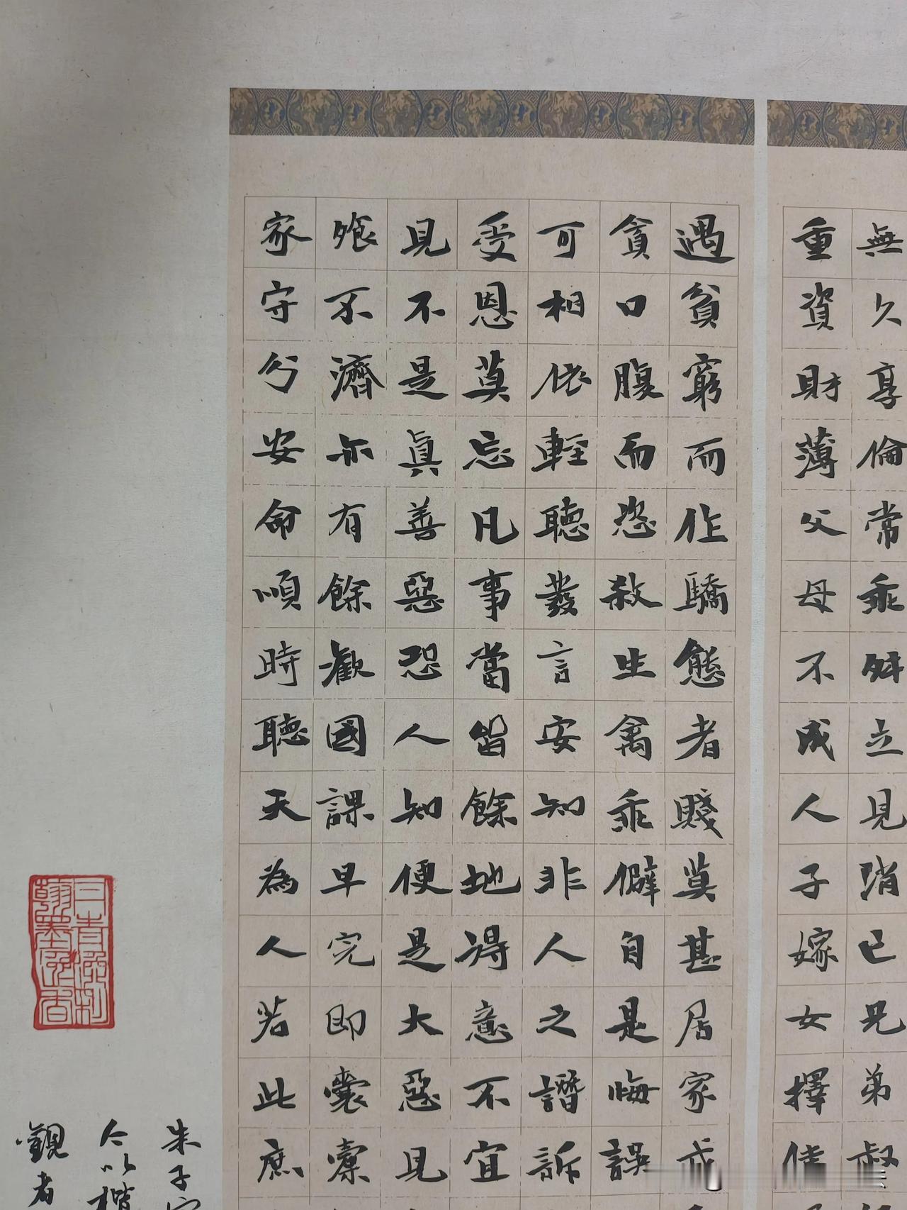 《朱子家训》里“一粥一饭,当思来处不易;半丝半缕,恒念物力维艰”,这些话语在魏楷的呈现下,更显庄重。我书写时,仿佛能感受到古人的智慧在笔尖流淌。而且魏楷那种古朴大气,让《朱子家训》的内涵更加深刻。看着自己写的这幅作品,满满的成就感,也希望能在大赛中取得好成绩!