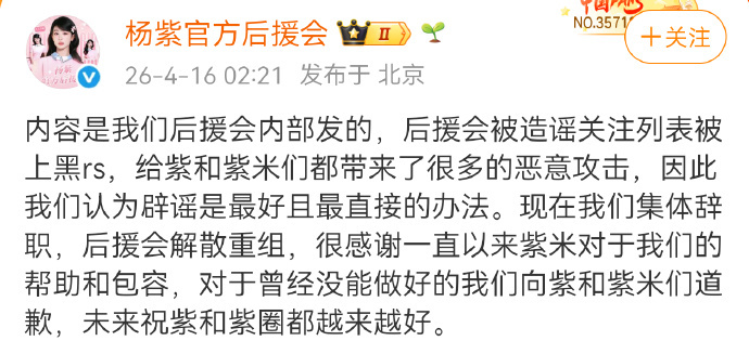 杨紫官方后援会因为昨天回应关注迪丽热巴超话的那条微博,现在要解散重组了。