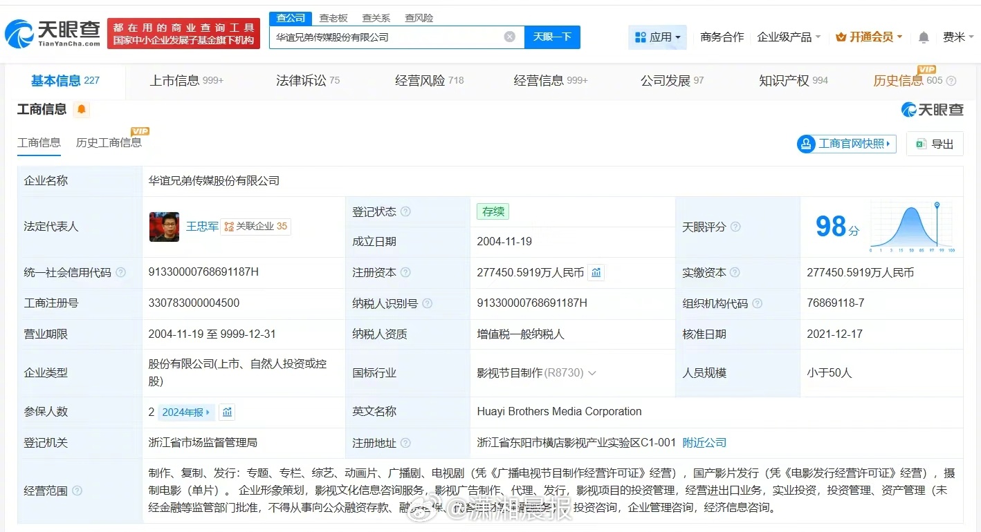 记者查询天眼查发现,华谊兄弟传媒股份有限公司成立于2004年11月,法定代表人为创始人王忠军,注册资本约27.7亿人民币,经营范围包括企业形象策划、影视文化信息咨询服务、影视项目的投资管理等,由王忠军等共同持股。法律诉讼信息显示,该公司及其法定代表人王忠军现存一则限制消费令,执行法院为北京市朝阳区人民法院,案件流程信息显示,此前,该公司已因此案被执行189万余元。控制企业信息显示,该公司旗下超十家企业已注销。