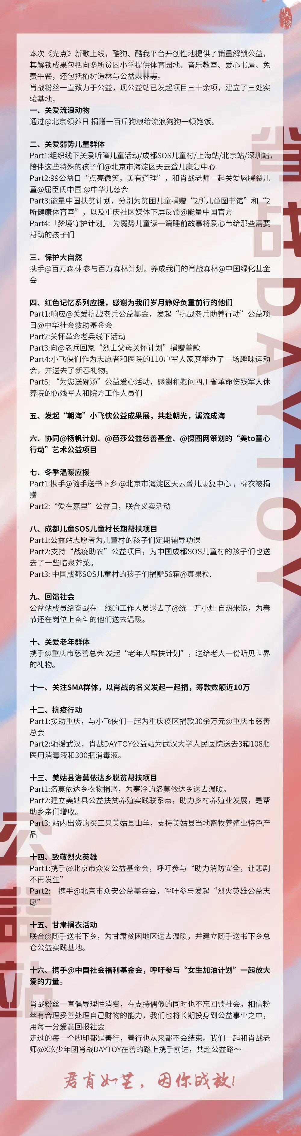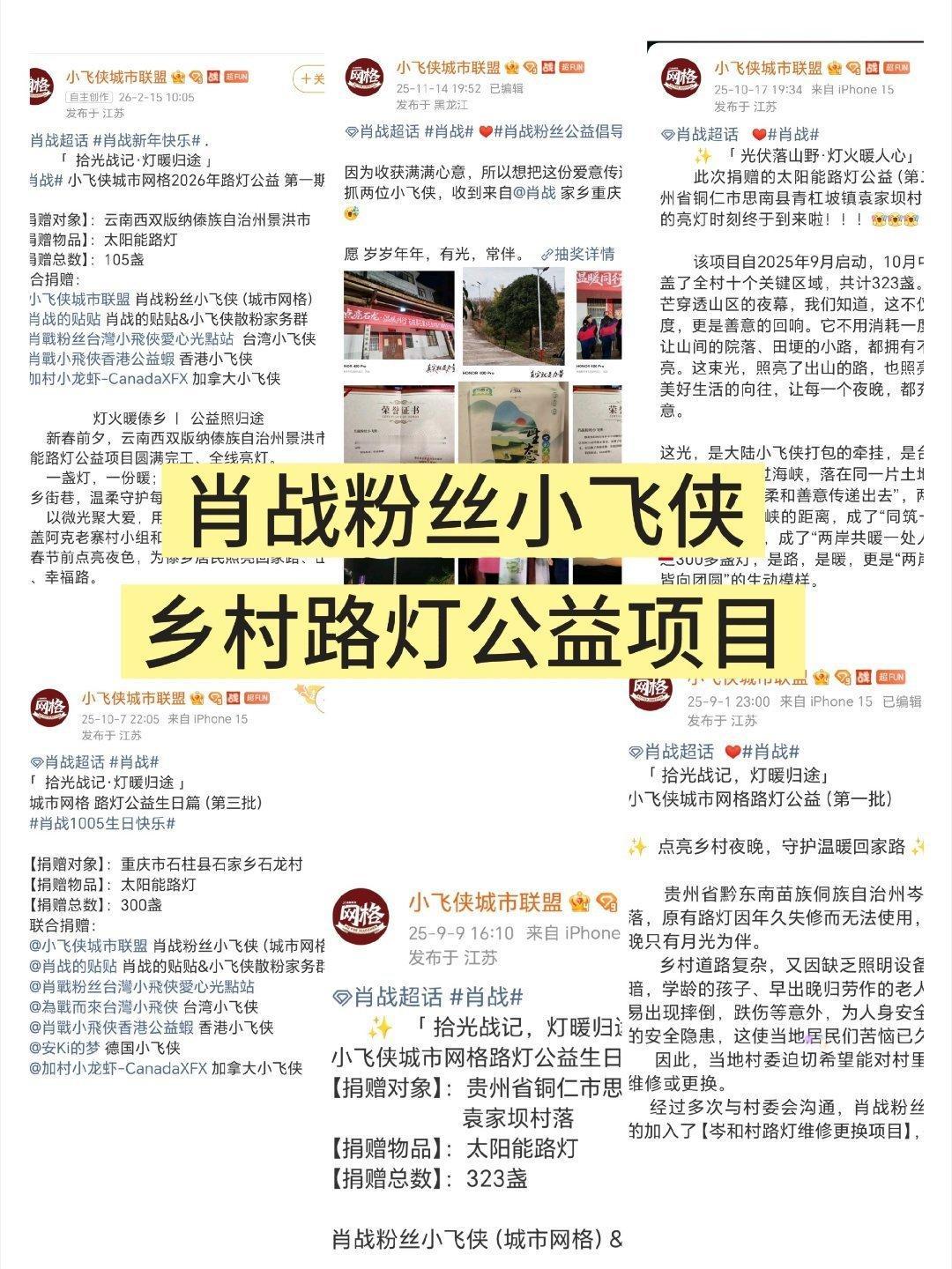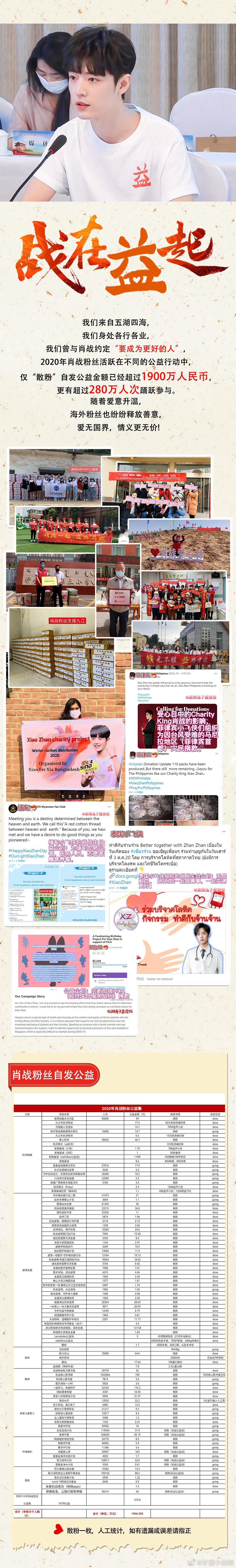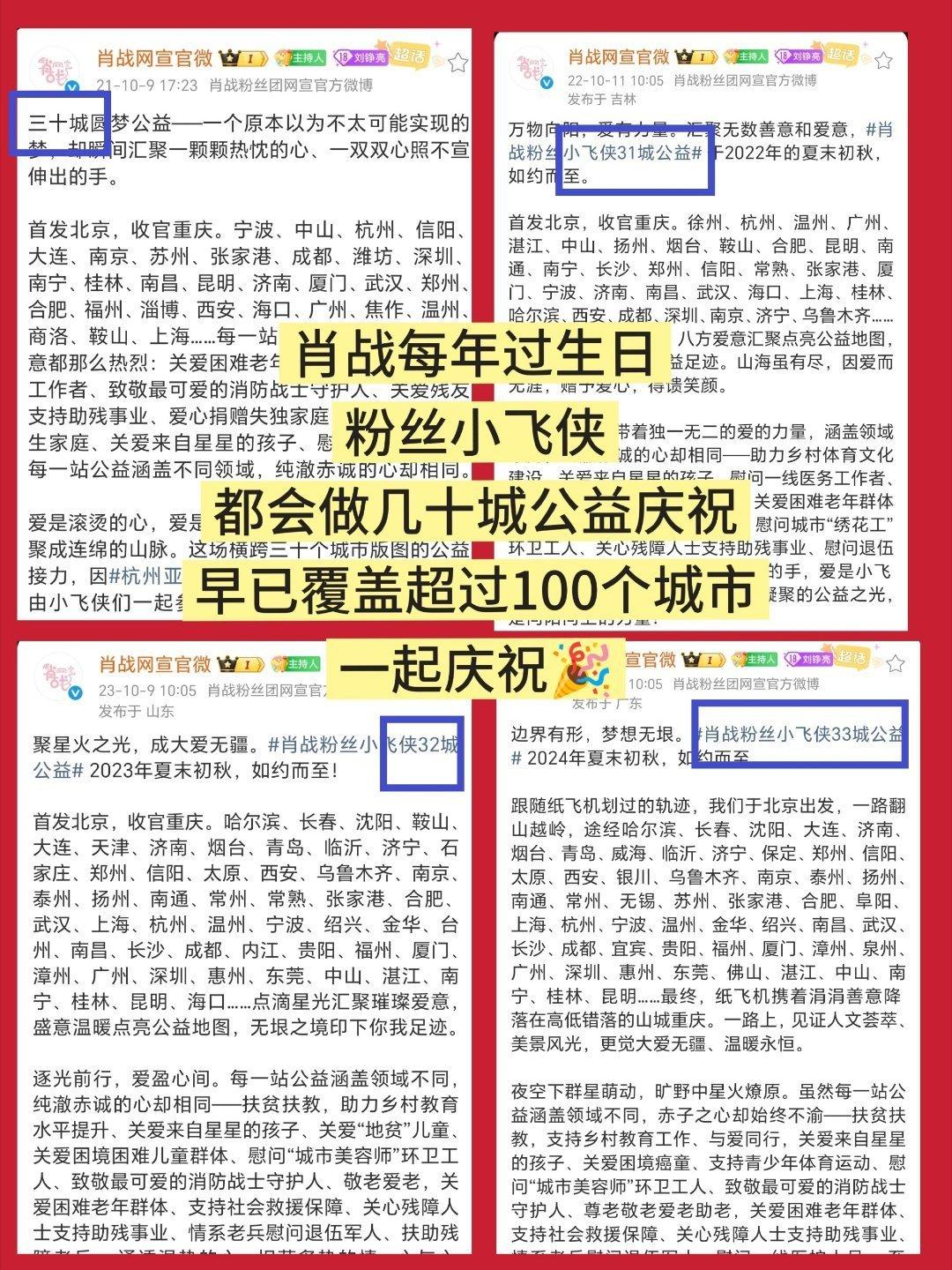 此外,多年来,小飞侠们在扶贫助农、抗灾救洪、教育志愿、乡村振兴、关爱老人儿童、关爱特殊群体、环保植树、生日公益等方方面面都在践行八个字:但行好事,莫问前程。在偶像肖战的正能量带领和影响下,以实际行动献出爱心,把爱撒向各个角落❤️。