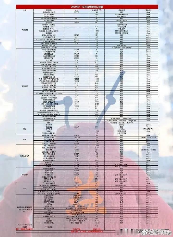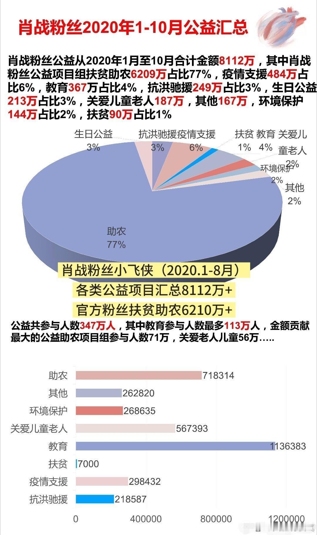 仅2020年1-8月期间,可以统计到的公益项目总额就超过8000万,其中肖战粉丝公益项目组扶贫助农总和就远超6000万。截至2020.12.31,肖战粉丝小飞侠全年公益总额超1亿元,累计参与人数超280万。