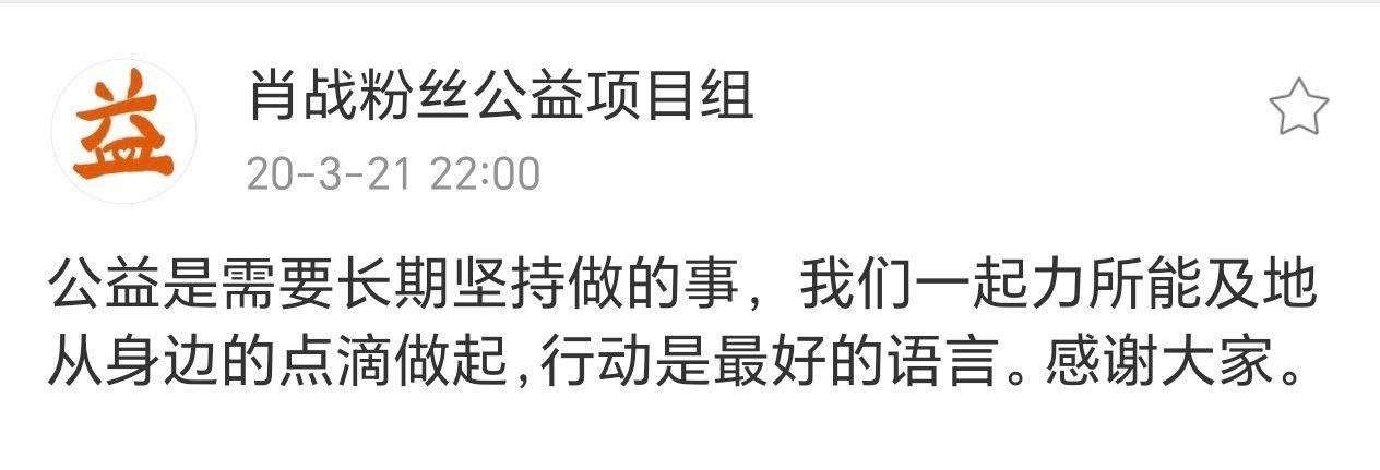 “公益是需要长期坚持做的事,我们一起力所能及地从身边的点滴做起,行动是最好的语言。感谢大家。”肖战粉丝小飞侠多年来,一直把对偶像@肖战 的点滴爱意汇聚成海。