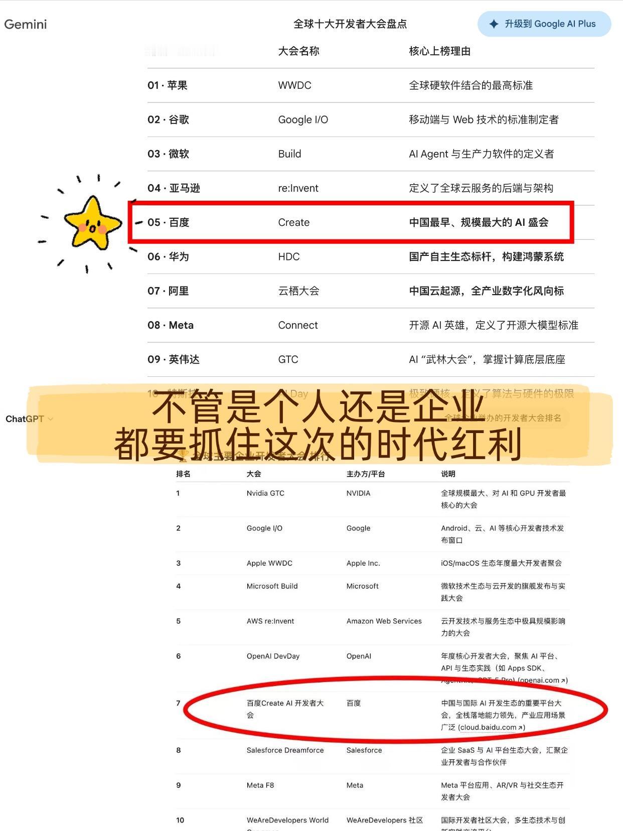 更值得期待的是,大会设置的20+专题论坛,全面覆盖AI+汽车、AI+医疗、AI+电商、AI+短剧等千行百业,30+AI公开课全是代码级实操演示,不管你是想切入全新赛道,还是升级现有项目,都能找到可直接落地的方法论。要知道,文心大模型、昆仑芯等改变行业格局的重大成果,都曾在Create大会首发,这次“两会合一”的战略升级,无疑会带来更密集的行业干货。