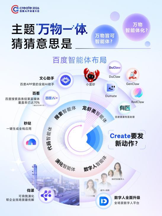 答案其实藏在百度的全生态布局里。首先这次大会的主题是“万物一体”,核心大概就是以智能体为纽带,打破技术、设备、场景与人的壁垒。这次大会上“龙虾全家桶”还会全员集结,从云端DuClaw、桌面端DuMate,到移动端RedClaw、智能硬件端小度龙虾,再到医疗版DoctorClaw,全场景智能体全面覆盖办公、生活、医疗等多个领域。近期DuClaw 还完成了重磅升级,打通了小度与百度地图,可以同步搞定日程查询、路况播报和出行规划,语音交互实时反馈,而且百度之前也推出了百看、文心助手、数字人、伐谋等智能体,直接把创业门槛拉到最低。