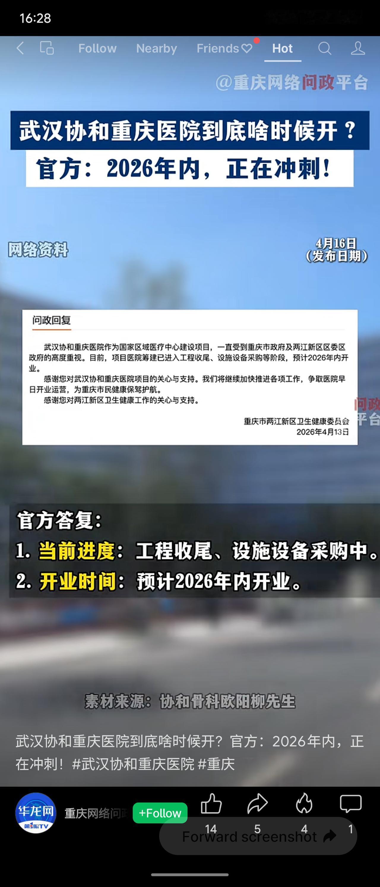 重庆本地市民多次询问武汉协和重庆医院开业时间,两江新区卫健委2026年4月13日