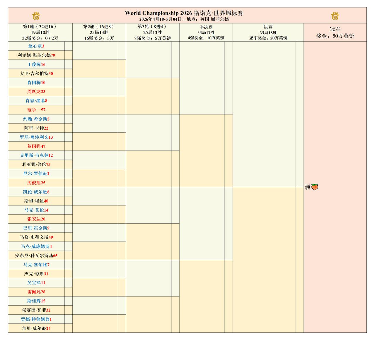 世锦赛正赛签表新鲜出炉,赵心童首轮迎战海菲尔德。精准解析! 世锦赛正赛抽签刚刚