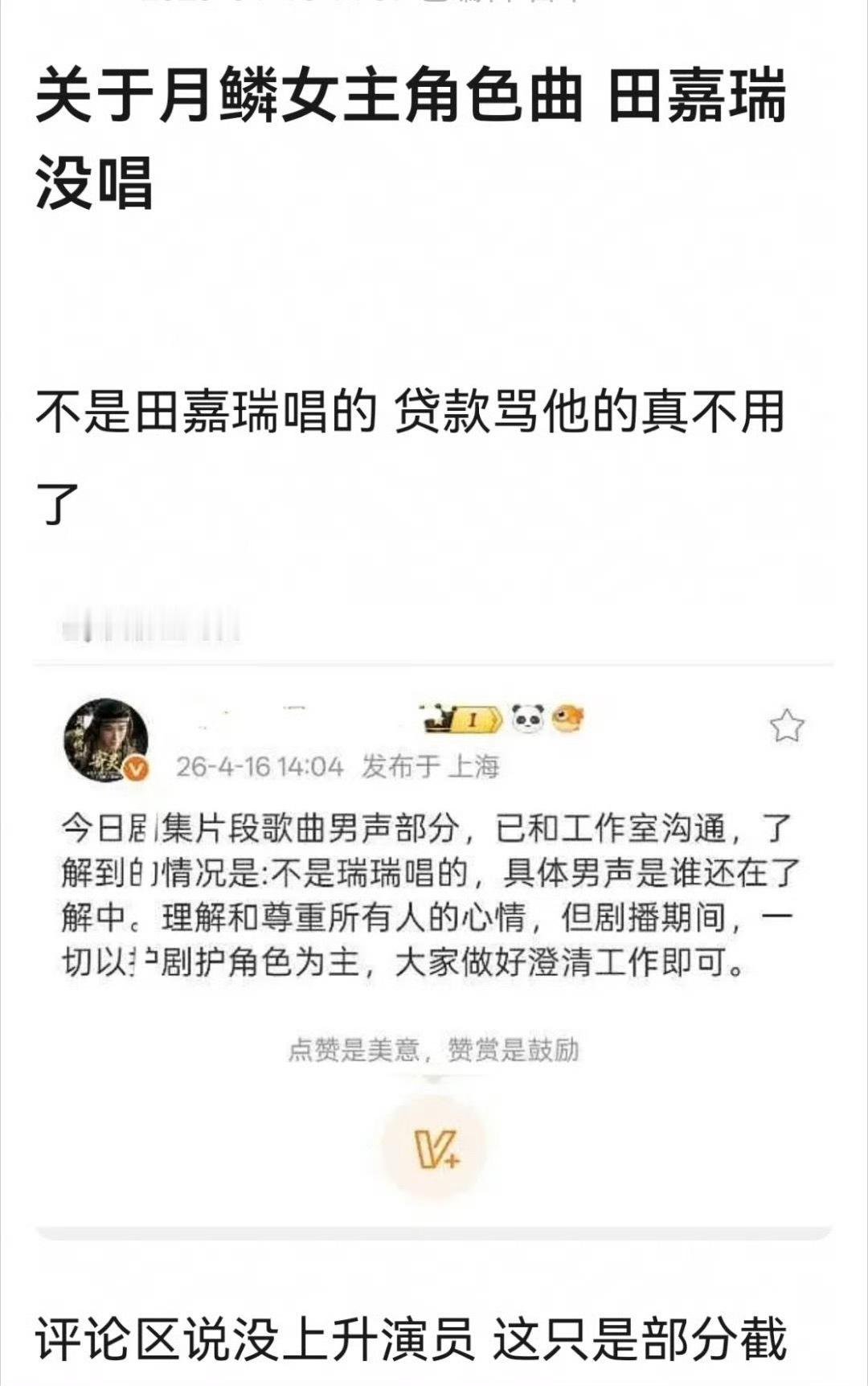 田嘉瑞粉丝澄清说《月鳞绮纪》女主角色曲田嘉瑞没有唱。