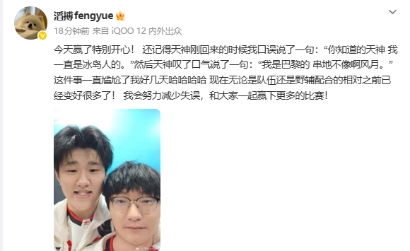 虎扑04月16日讯战胜BLG后,fengyue发文: