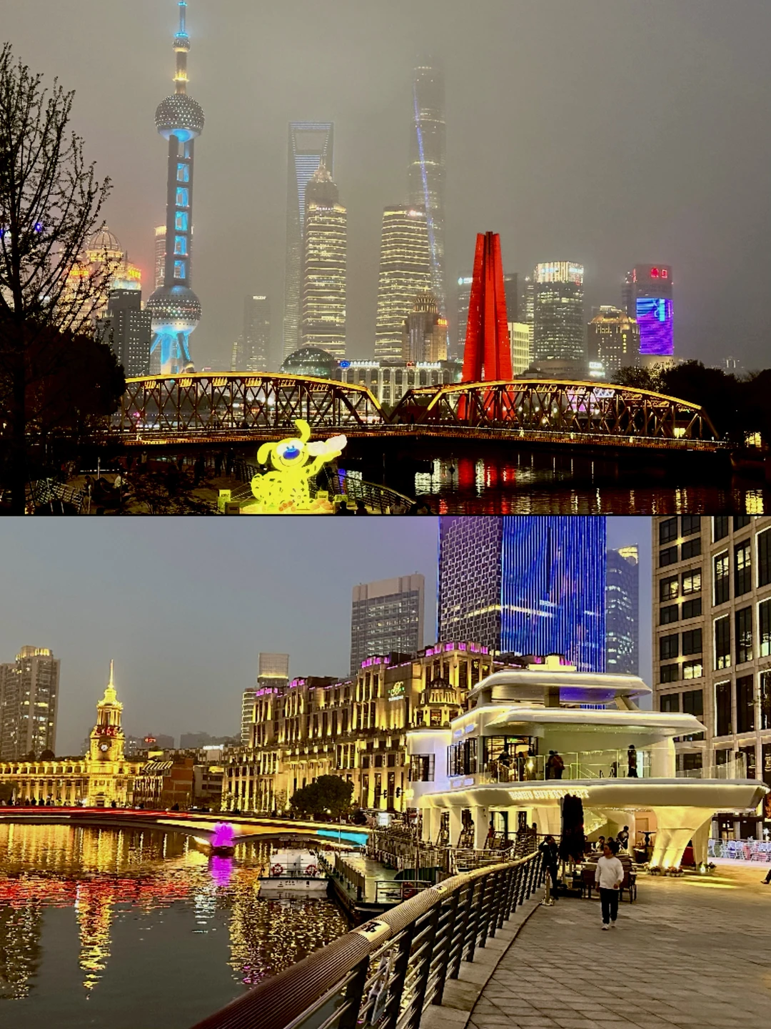 1️⃣ 巨轮甲板位:站在平台延伸处,背景就是陆家嘴+外白渡桥,傍晚亮灯时蓝调绝美
