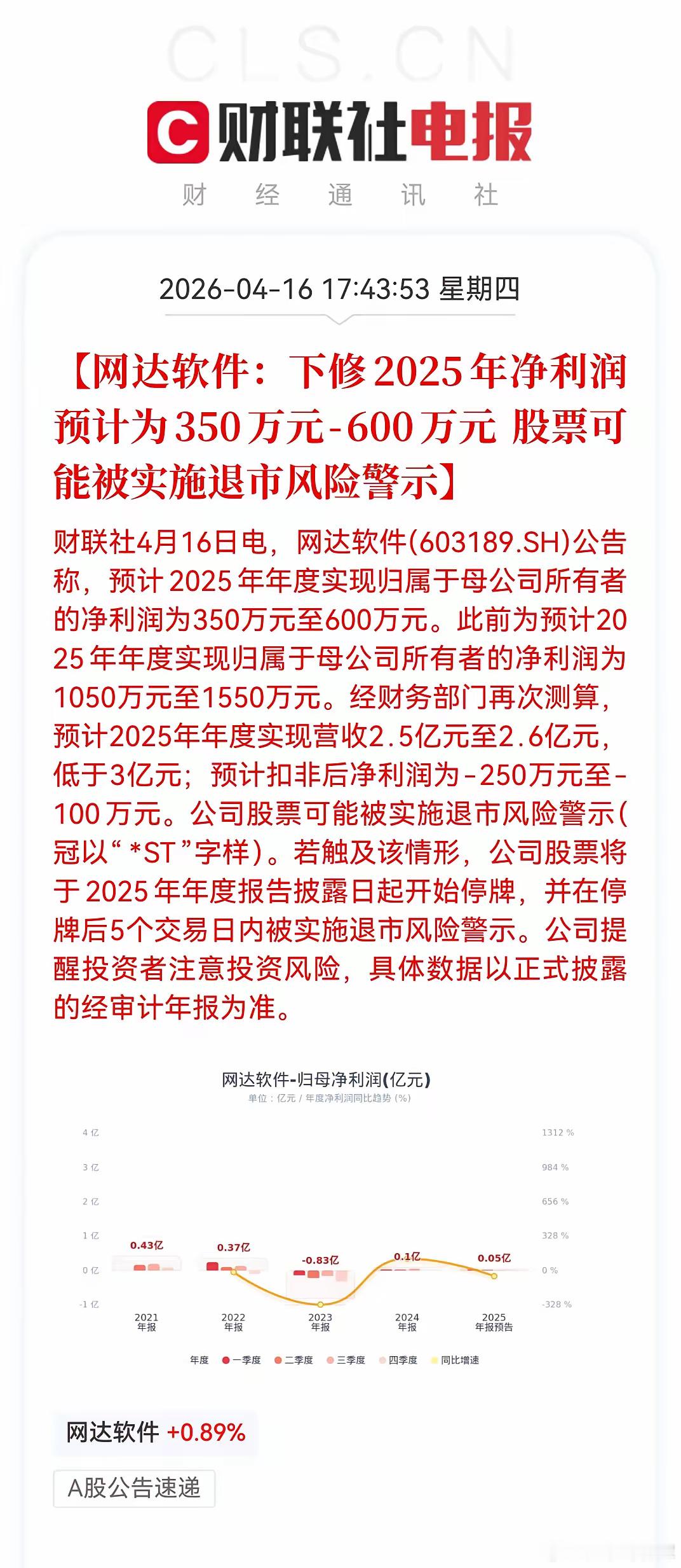 另外一家公司是网达软件也发布了同样的公告,数据显示,预计2025年归母净利润350-600万元,预计实现营收2.5亿元至2.6亿元,低于3亿元,公司股票可能被实施退市风险警示(冠以“*ST”字样)