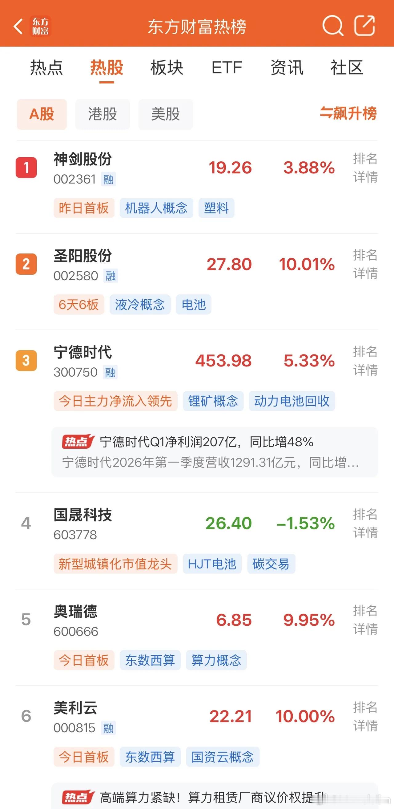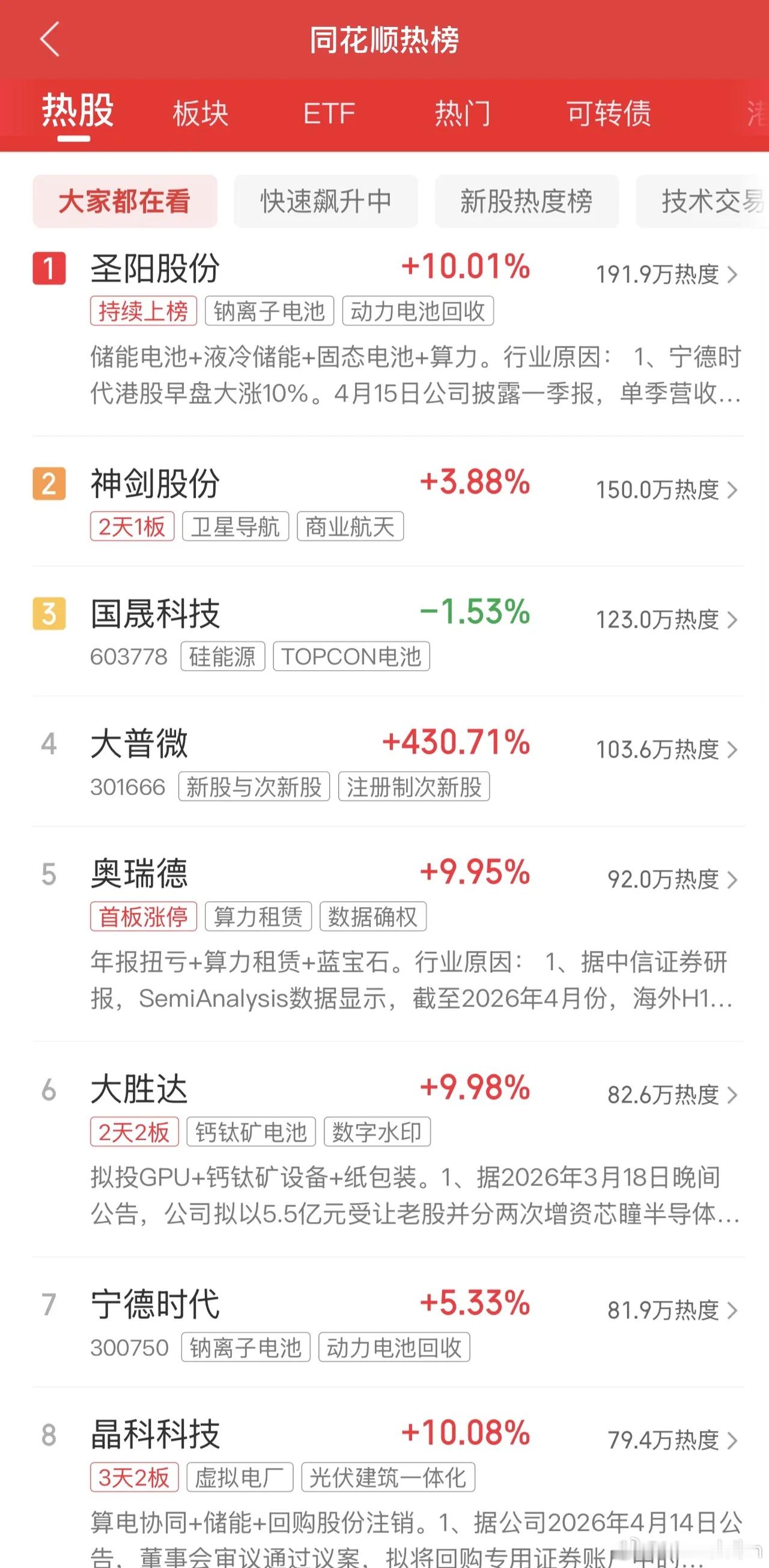 2026年4月16日,各大股吧前十热股:淘股吧: 1.圣阳股份 2.大胜达 3.宁德时代 4.胜视科技 5.美丽云 6.博云新材 7.宏景科技 8.龙蟠科技 9.钧达股份 10.美诺华东财吧: 1.神剑股份 2.圣阳股份 3.宁德时代 4.国晟科技 5.奥瑞德 6.美丽云 7.蓝色光标 8.大普微 9.宏景科技 10.哈药股份同花顺: 1.圣阳股份 2.神剑股份 3.国晟科技 4.大普微 5.奥瑞德 6.大胜达 7.宁德时代 8.晶科科技 9.中嘉博创 10.新朋股份