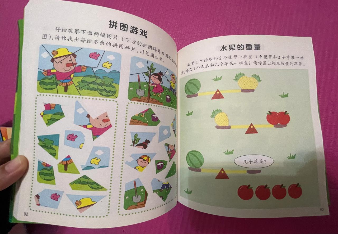 [比心]等孩子再大一点,就可以挑战难度更大的思维训练。如根据碎片拼出一幅完整的图,根据水果重量,推理出一个西瓜等于几个苹果的重量。