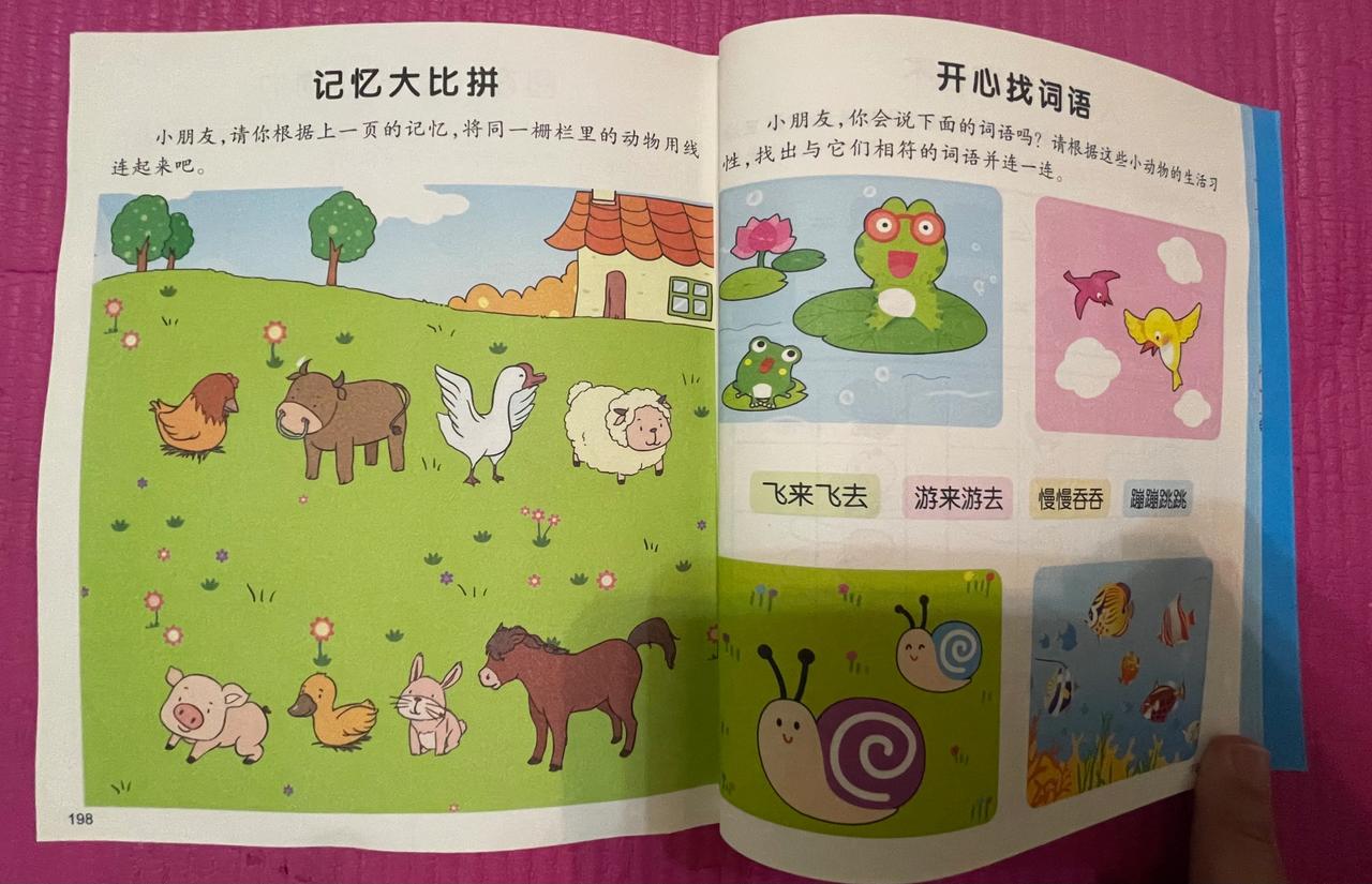 比如先让孩子看一看,每一个栅栏里分别住着哪些小动物?这一阶段,可以让孩子大声读出来,因为通过看和读,孩子的印象会更深刻。