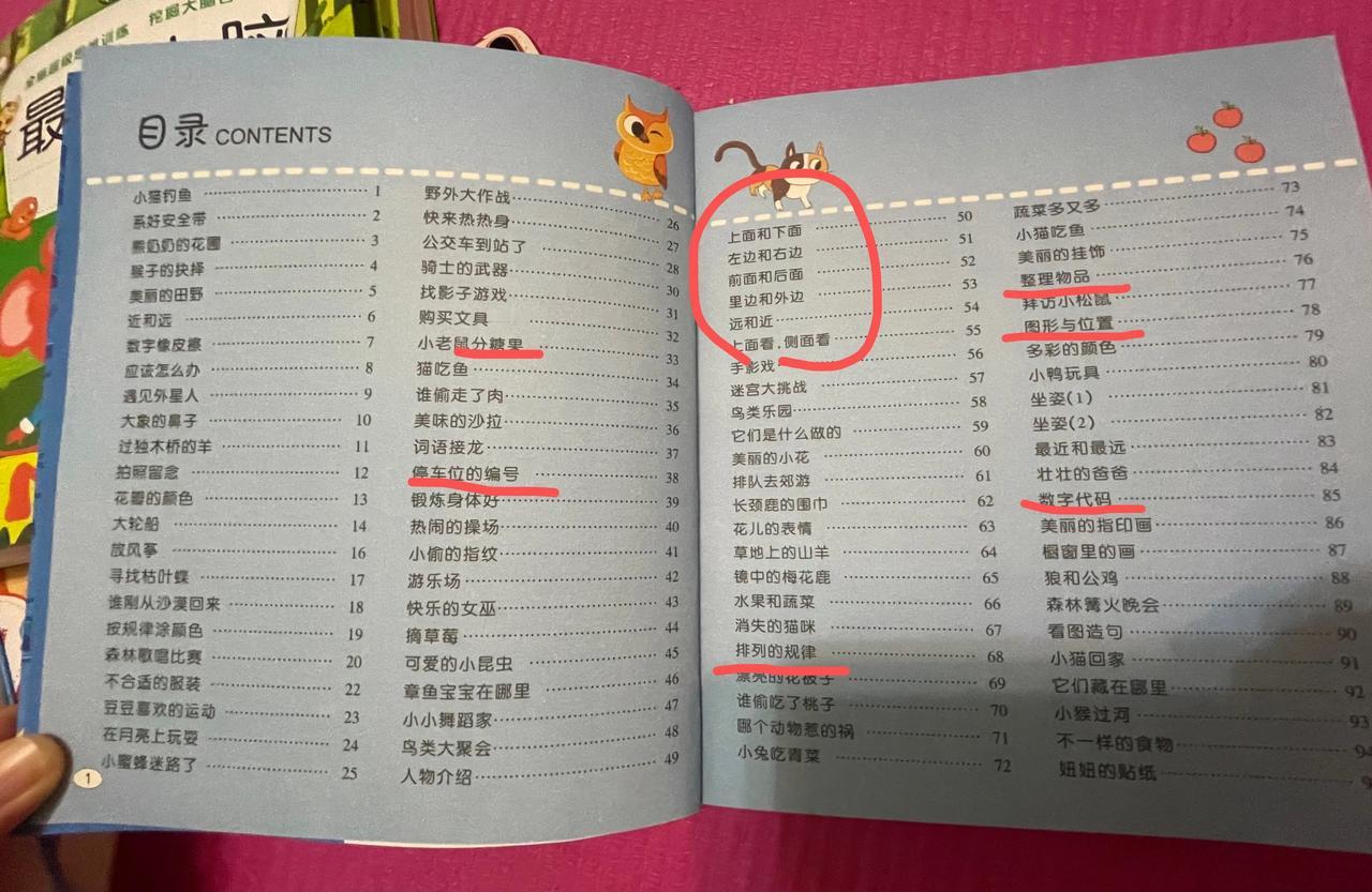 如给车位编号,上下、左右、前后、里外等空间概念的辨别,图形与位置的配对,找规律等等。