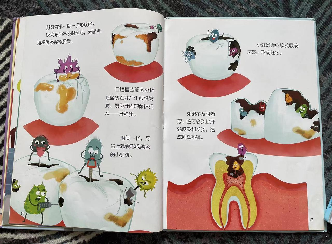 每次刷牙前,我都先带她读一遍其中的《蛀牙日记》。让她知道,细菌是怎么跑到她牙齿里的,又是怎样发展壮大的。