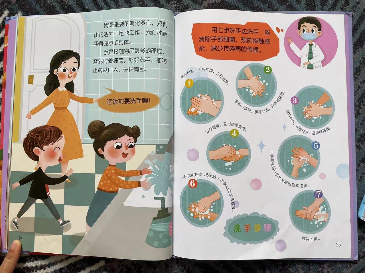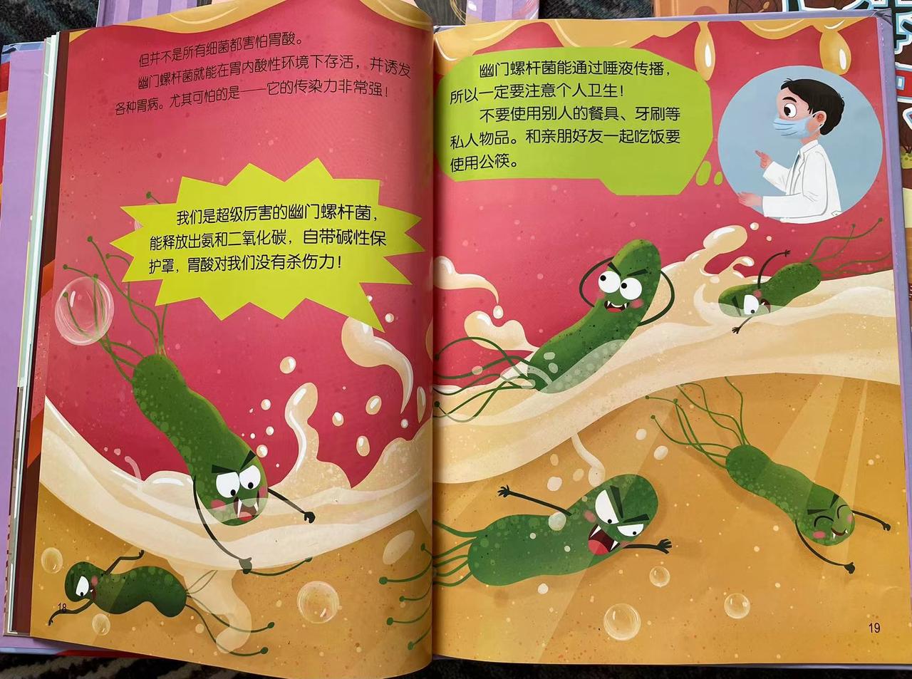 还有胃部细菌,孩子就能看到,细菌是如何在我们胃里被消灭,它们又是如何存活下来。并且,故事还引导孩子用“七步洗手法”正确洗手,勤洗手,防止病从口入。