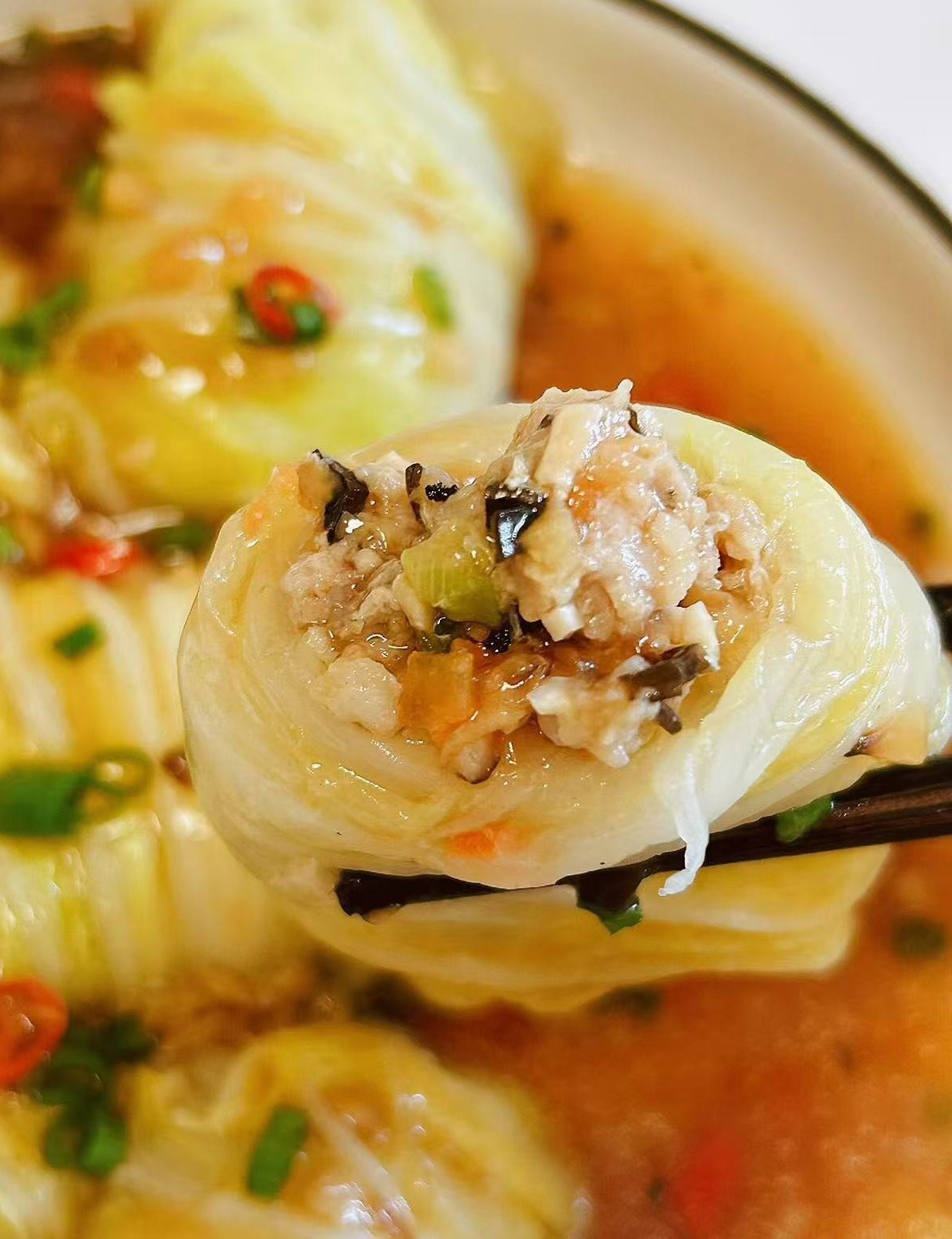 调一碗料汁(生抽 + 蚝油 + 淀粉 + 水),爆香蒜末小米辣,倒入料汁煮稠,淋在白菜卷上白菜富含膳食纤维,搭配低脂肉馅,吃着清爽不油腻,给肠道 “减负”,排便更顺畅!