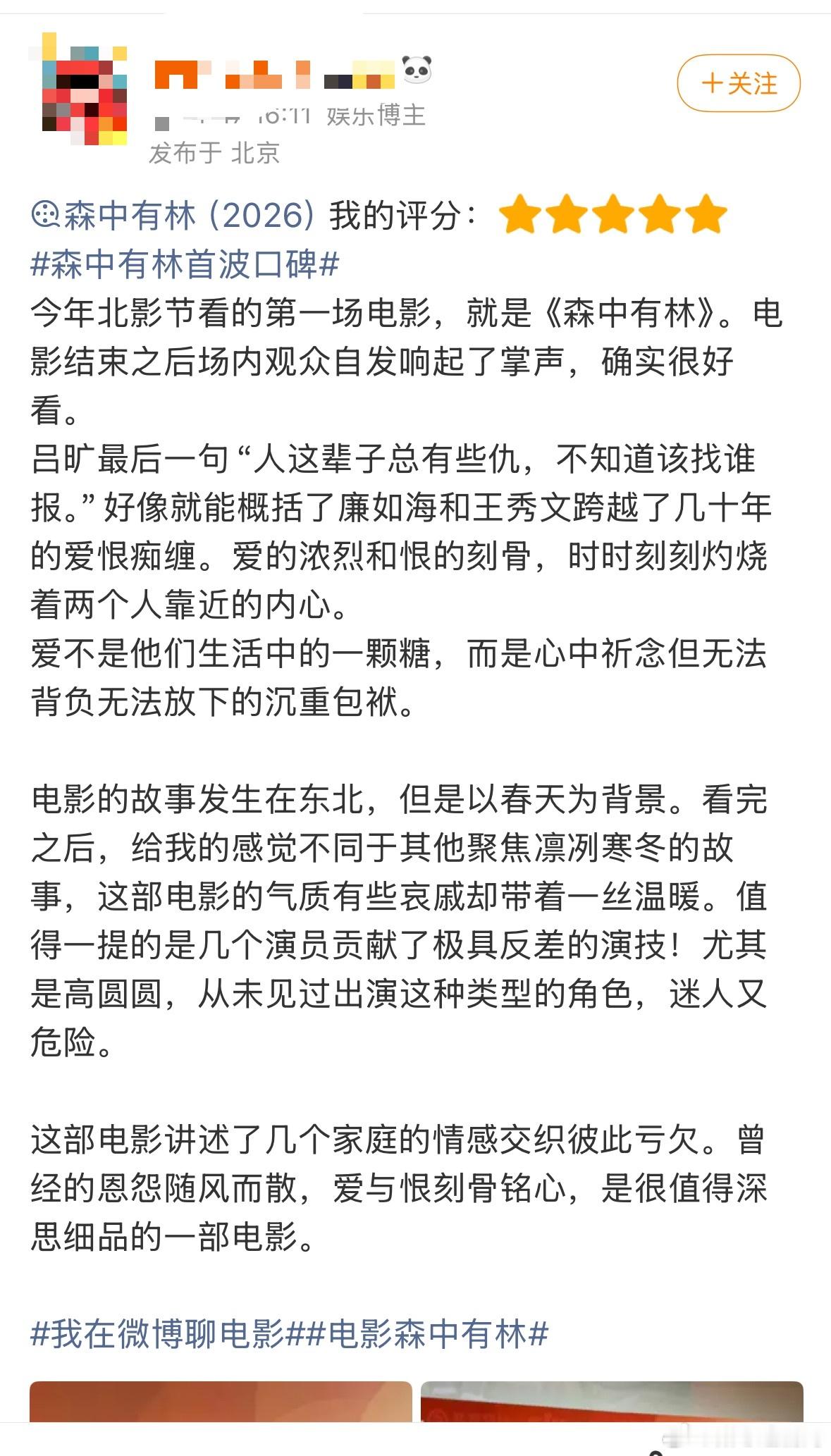森中有林首波口碑 首波好评刷屏!郑执自编自导还原原著灵魂,四十年恩怨纠缠猎奇又深刻。于和伟一眼道尽半生苍凉,高圆圆挣脱滤镜演复杂美人,爱恨拉扯顶级震撼。悬疑与爱情交融,文艺又生猛,五一档首选!