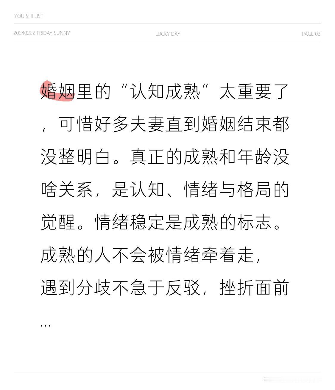 婚姻里的“认知成熟”太重要了,可惜好多夫妻直到婚姻结束都没整明白。真正的成熟和年龄没啥关系,是认知、情绪与格局的觉醒。