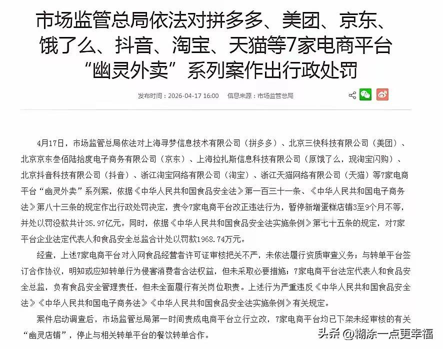 今天,7家头部互联网平台因“幽灵外卖”合计被罚没35.97亿,如果从主体看,阿里