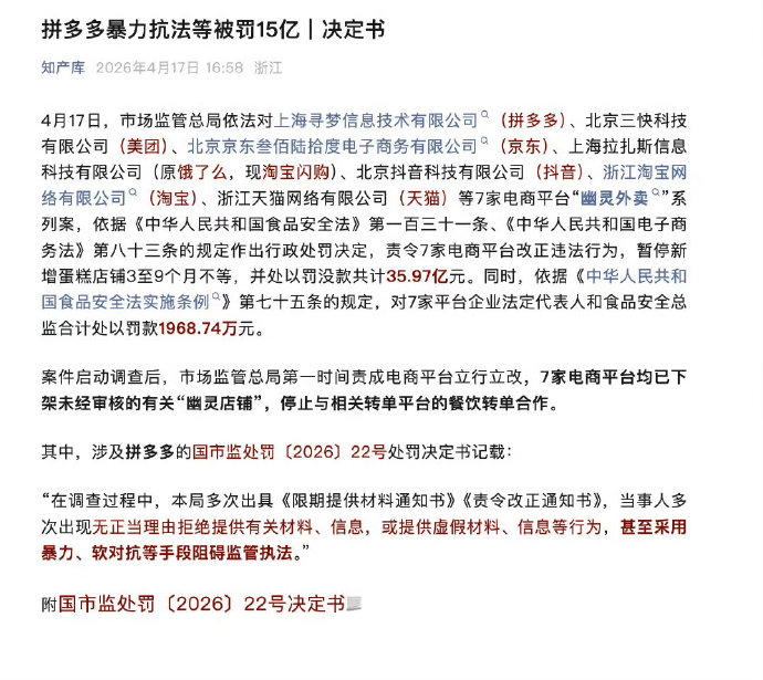 下班回来看到国内几个非常有名的包租公,拼多多美团京东淘天抖音,总共被罚35亿。其中拼多多因为暴力抗法、伪造信息,直接被顶格罚了15亿。