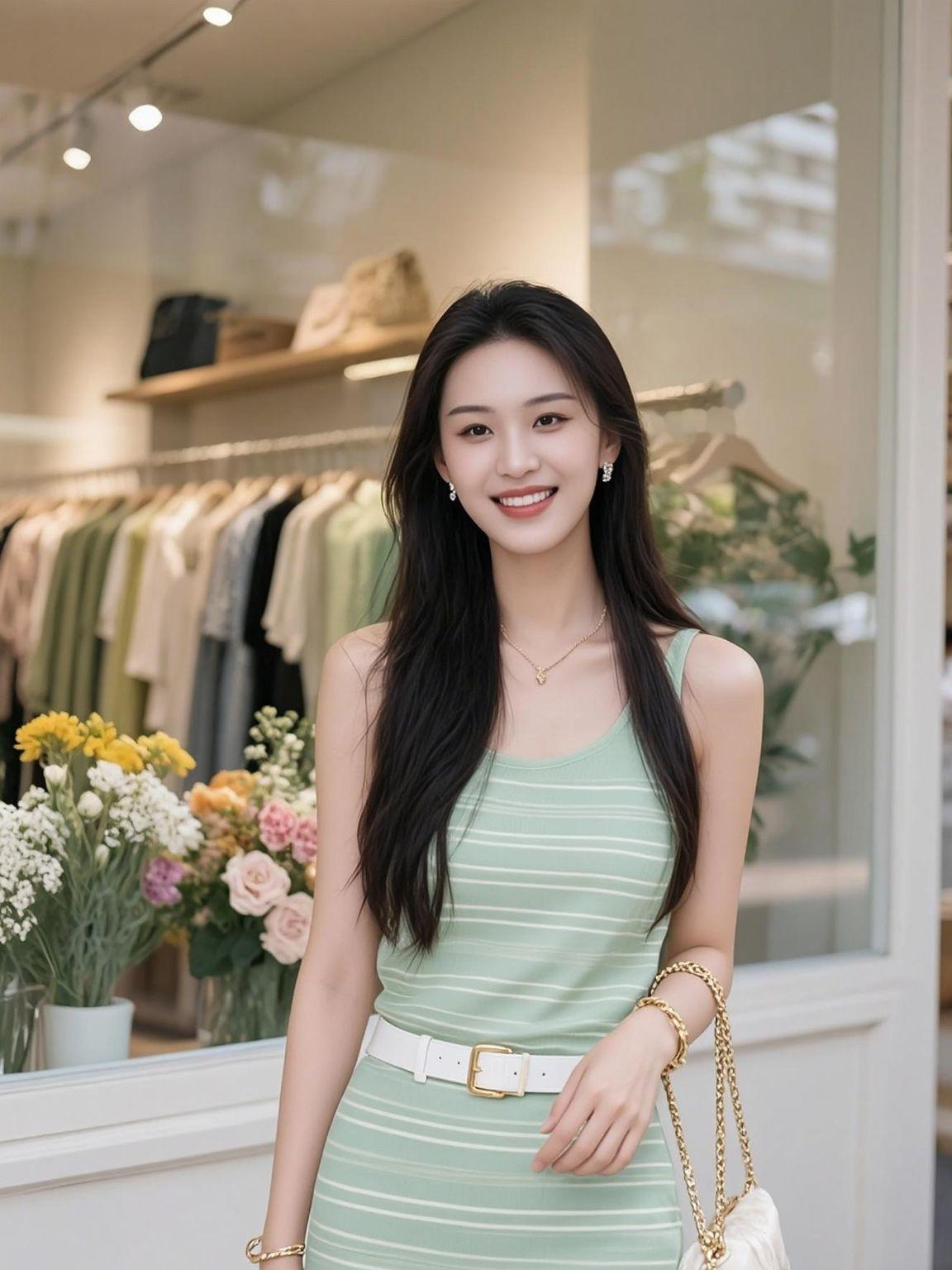 夏日的阳光洒在街头,温柔的光影与清新的穿搭相得益彰。薄荷绿的背心搭配简约牛仔裤,仿佛是大自然的调色盘,为炎热的天气带来一丝凉意。橱窗里的绿植与阳光交织,营造出一种悠闲的氛围,让人忍不住驻足欣赏。这样的穿搭,不仅是对夏天的致敬,更是对生活的热爱。