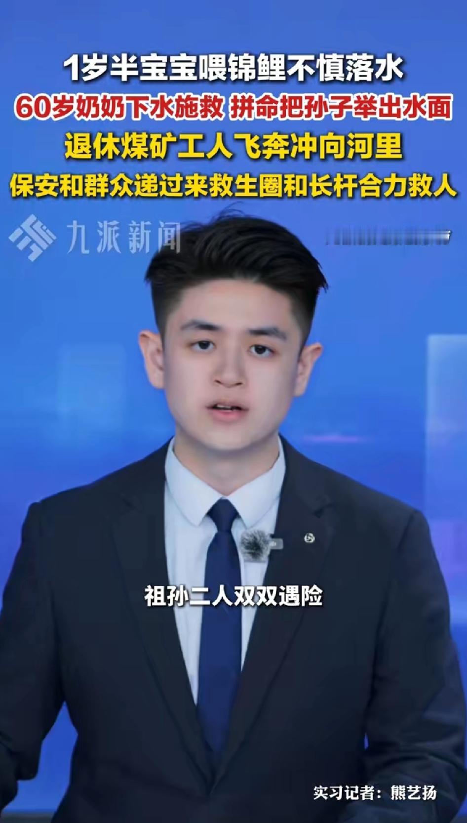 1岁半宝宝喂锦鲤不慎落水,60岁奶奶急忙下去营救,拼命把孙子举出水面,退休煤矿工人飞奔冲向河里,保安和群众递过来救生圈和长杆合力救人,奈何水里有青苔和斜坡,最终祖孙二人双双遇难。