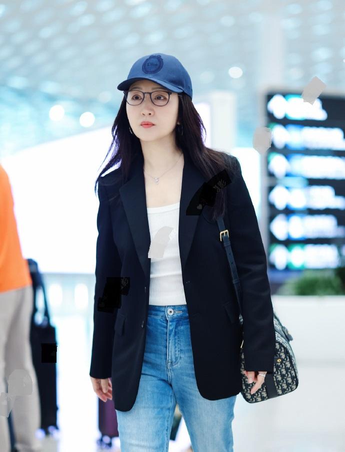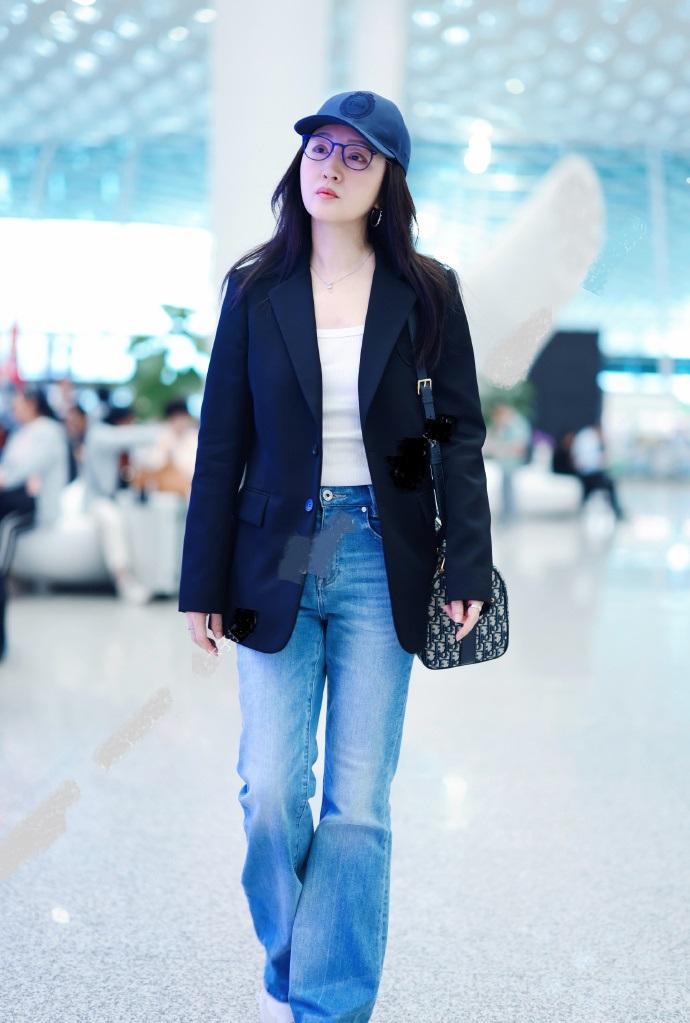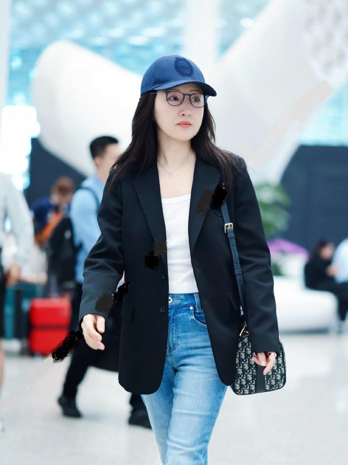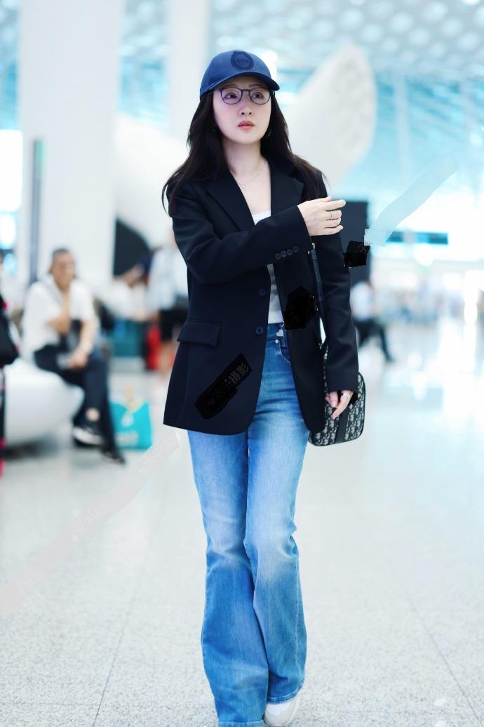 杨钰莹里面穿白色打底衫,外面套着黑色的西装,两件衣服叠穿的效果很不错。