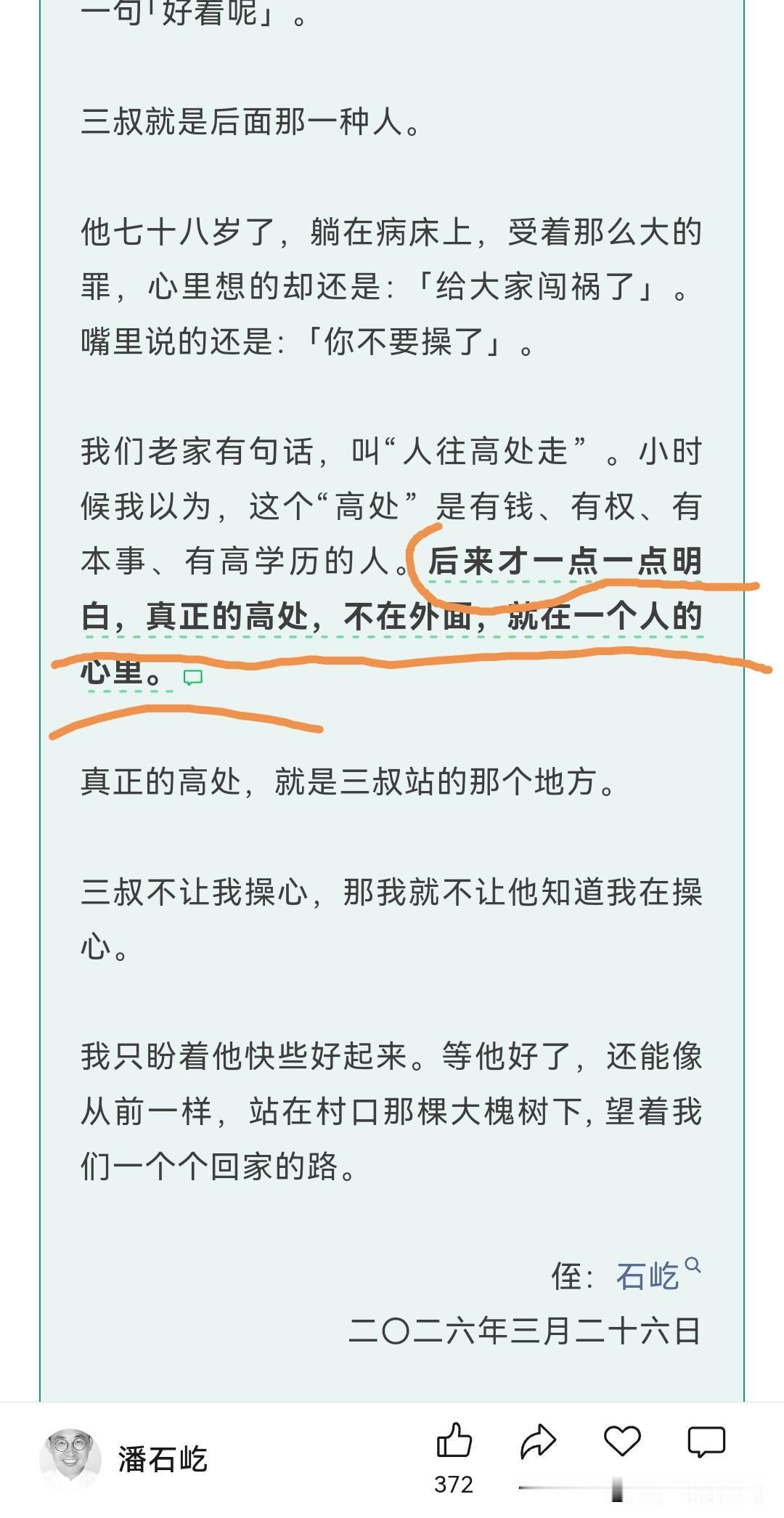 原来只把潘石屹看成一个商人,通读最近潘石屹的几篇文章,才发现潘石屹更是一个文人,一个有文化底蕴,可以把一件事情给你娓娓道来的散文家。对于他三叔帮助别人受伤的事,他的感悟不是三叔多管闲事,而是“人生真正的高处,不在外面,而是在一个人的心里”。很多有钱的商人,把金钱当做荣耀,最后留下一摊烂账,而老潘还是那个老潘。