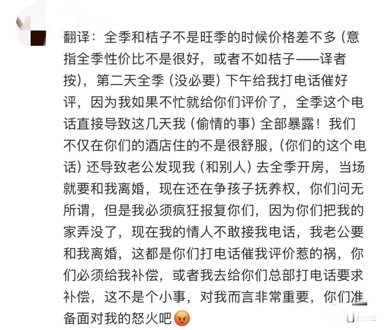 话说,酒店在人家休息时间打电话回访确实打扰了休息,但是难道是酒店让她出轨的吗?怎么都怪到酒店头上呢?