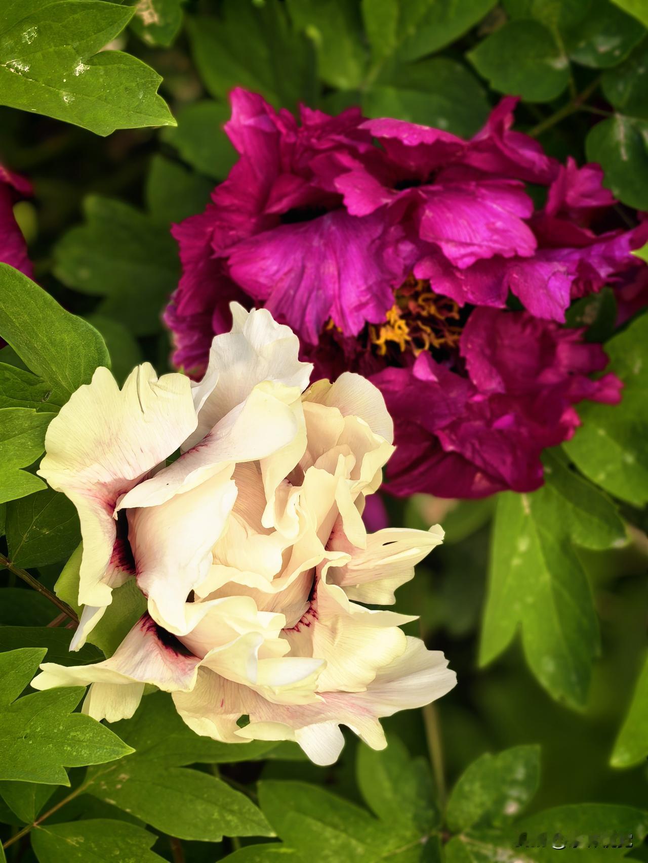 随拍 牡丹 素艳红妆并一枝,玉肌紫袂两相宜。春光不负倾城色,各占风流一段诗。翠叶层叠承春光,紫白牡丹相映成趣。深红如霞,凝着岁月沉淀的雍容;浅白似玉,藏着不染尘俗的清雅。二者同枝绽放,红是热烈,白是静婉,各揽风华一段。蜂蝶隐于花蕊,沾着春日的甜香,更衬得这满园春色鲜活生动。花开正好,不负东风。这般景致,恰如人生,各有姿态,却都在属于自己的时节里,开得尽兴又从容。粉紫牡丹 牡丹拍摄