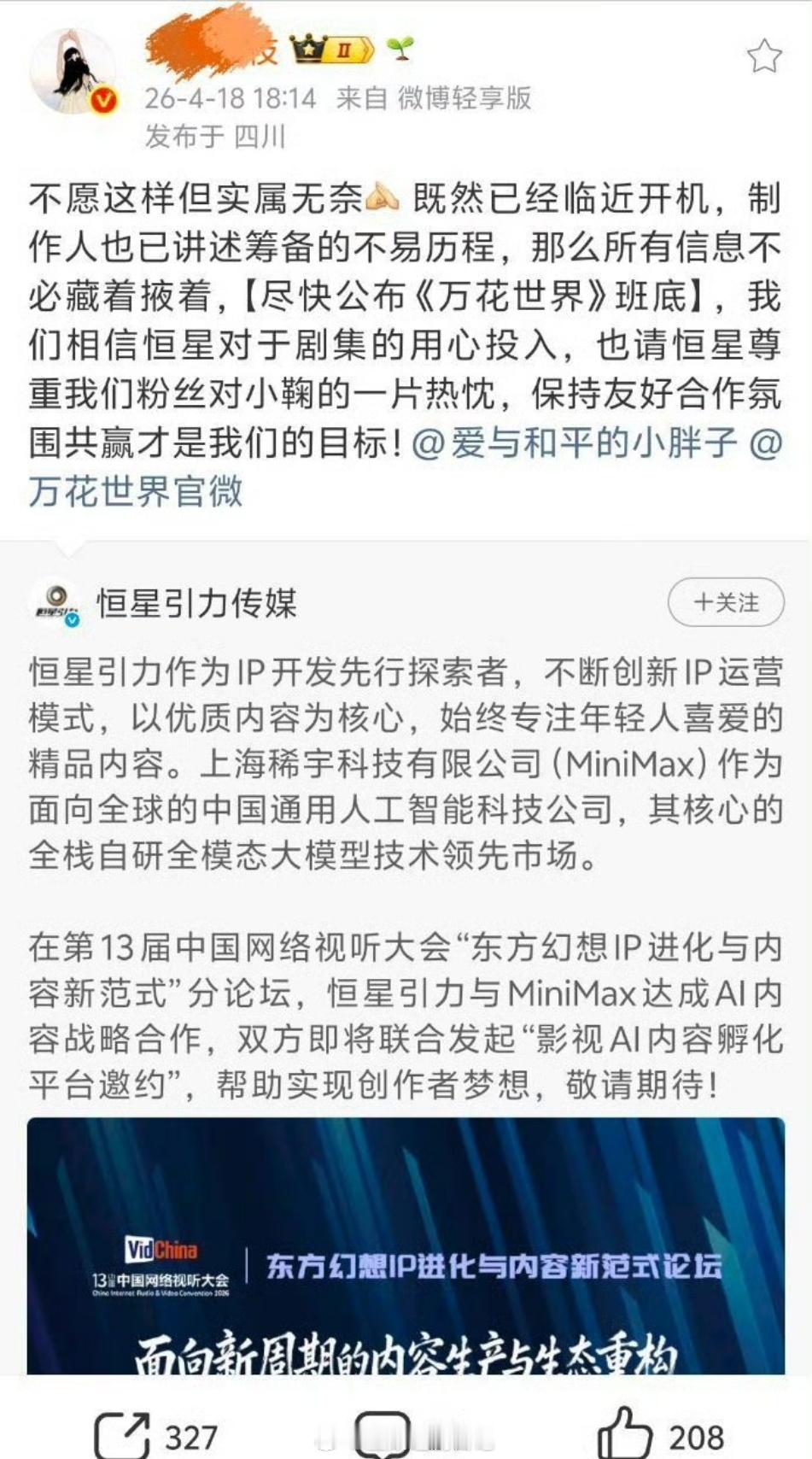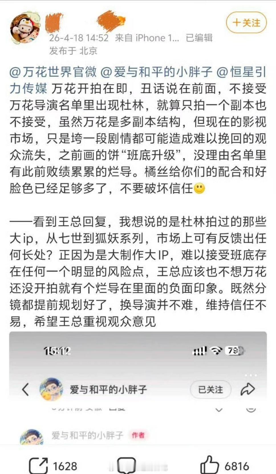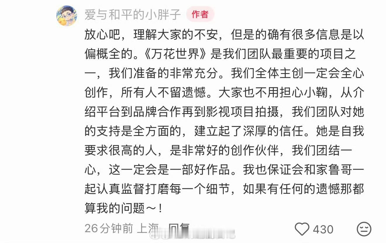 王一栩确认鞠婧祎《万花世界》多位导演协作,杜林导演是其中一位!筹备完善,是其团队最重要的项目之一,和鞠婧祎建立起了深厚信任,并全面支持~夸小鞠对自我要求很高,是非常好的创作伙伴。一定会用心给大家带来好作品鞠婧祎粉丝wq 万花世界五月开机