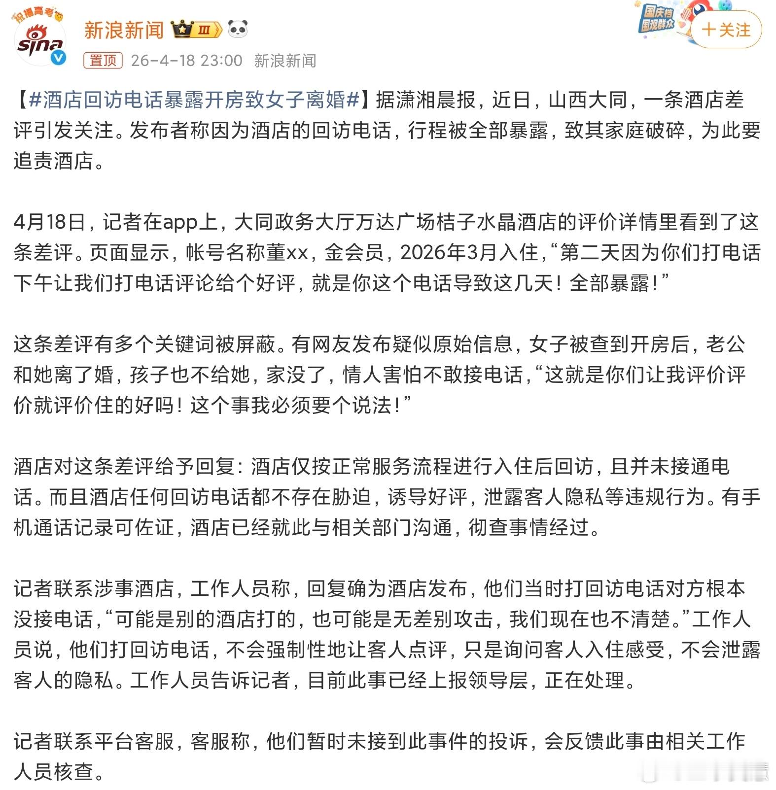 酒店回访电话暴露开房致女子离婚酒店打回访电话妥妥是行业大忌啊订房的人不一定是开房