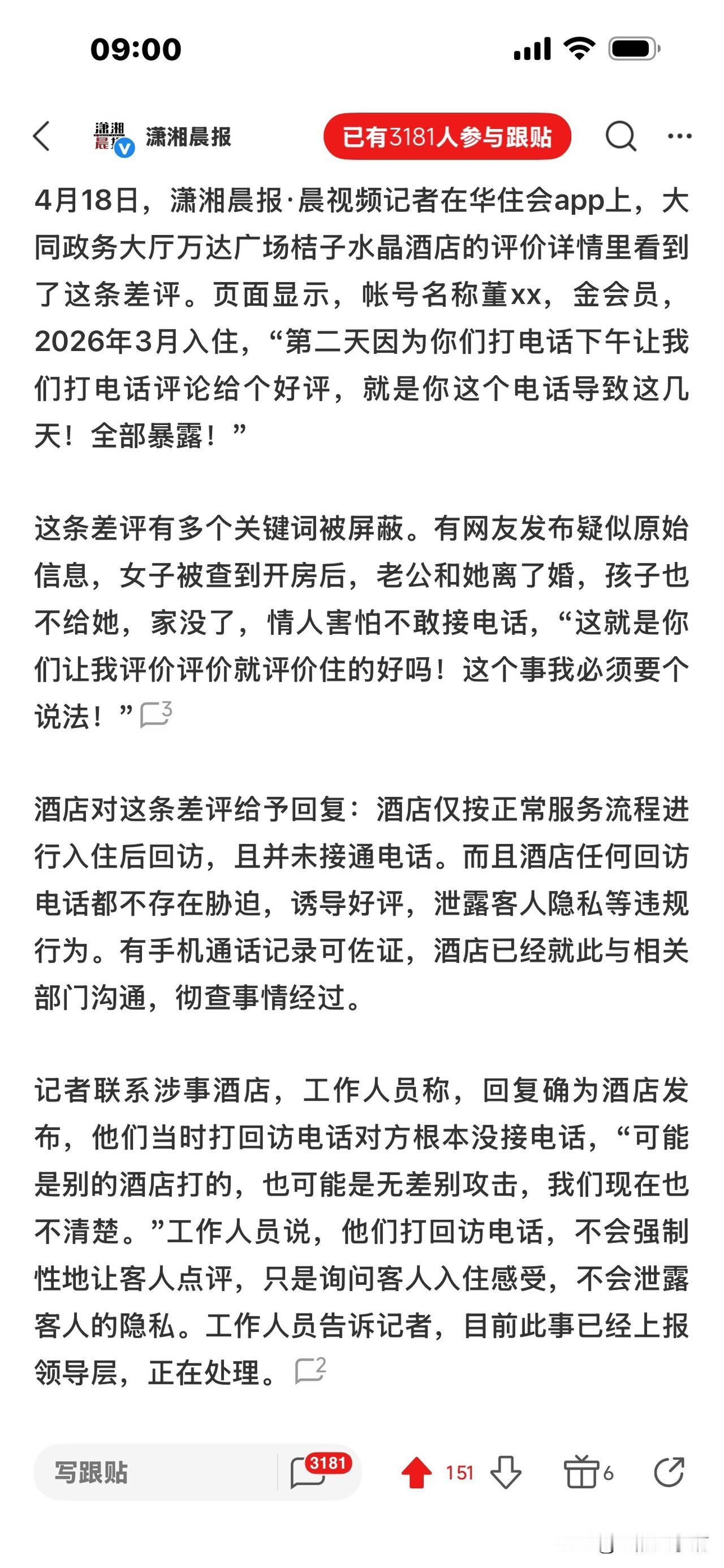 记者就此事致电当地桔子水晶酒店。