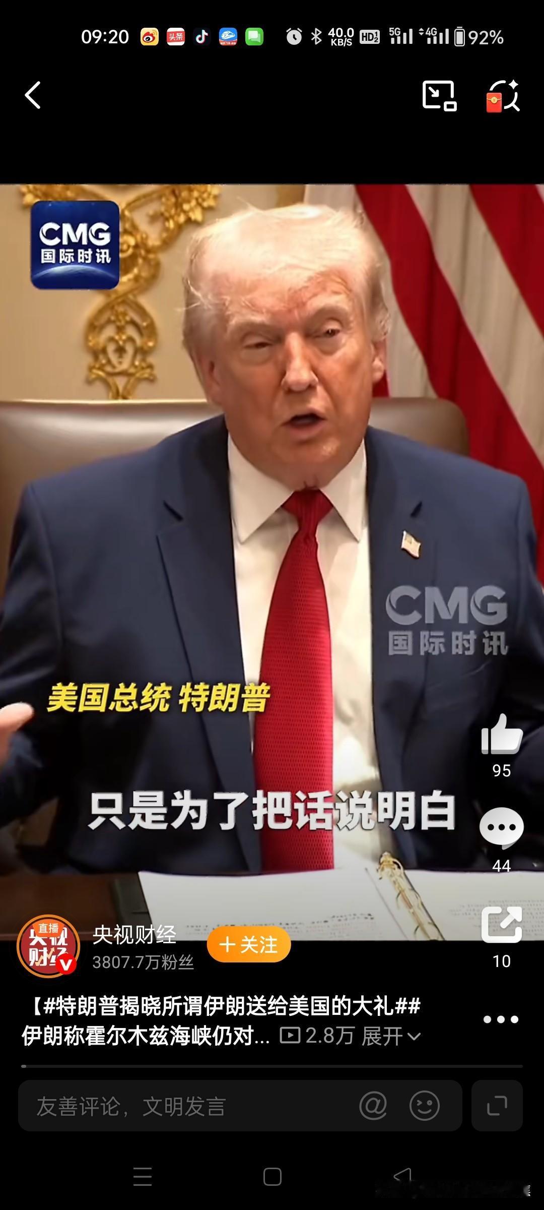 他并未宣称“让伊朗灭亡”,而是强调美国会维持对伊朗的海上封锁,直至双方达成“交易”。此前(3月26日),他仅将伊朗允许10艘油轮通行称作“谈判诚意”的“大礼”。@央视财经25澎湃新闻央视新闻央视财经头条新
