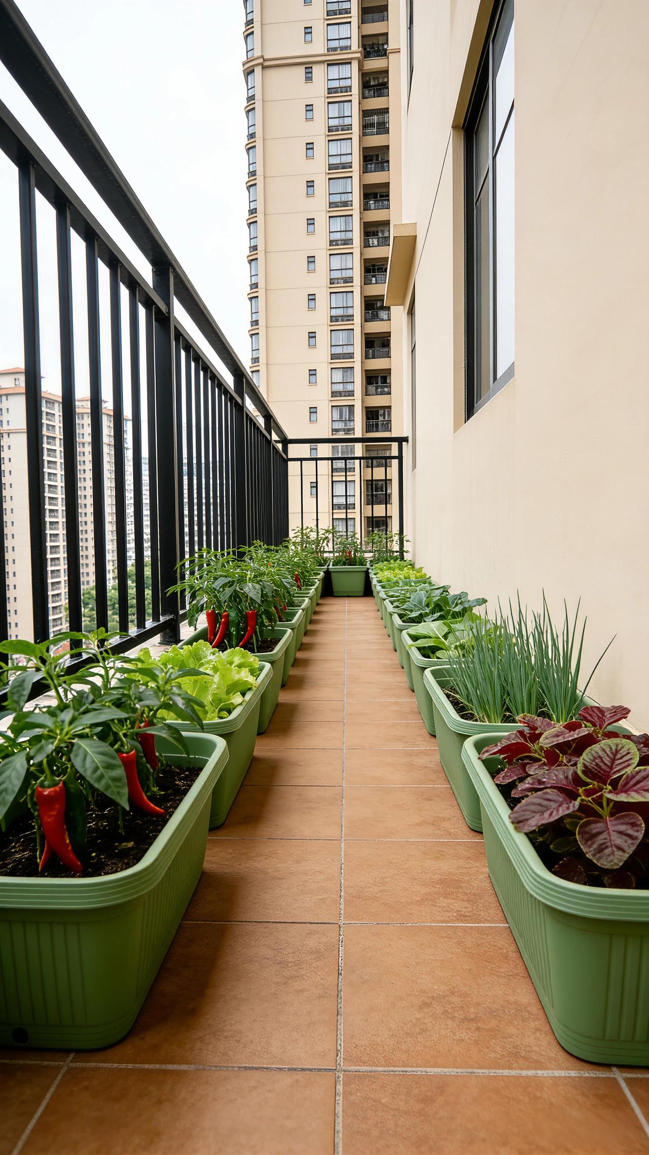 在阳台开辟一片小菜园,一年能省下好几千菜钱💰 高层阳台摆上长条种植盆,辣椒、小