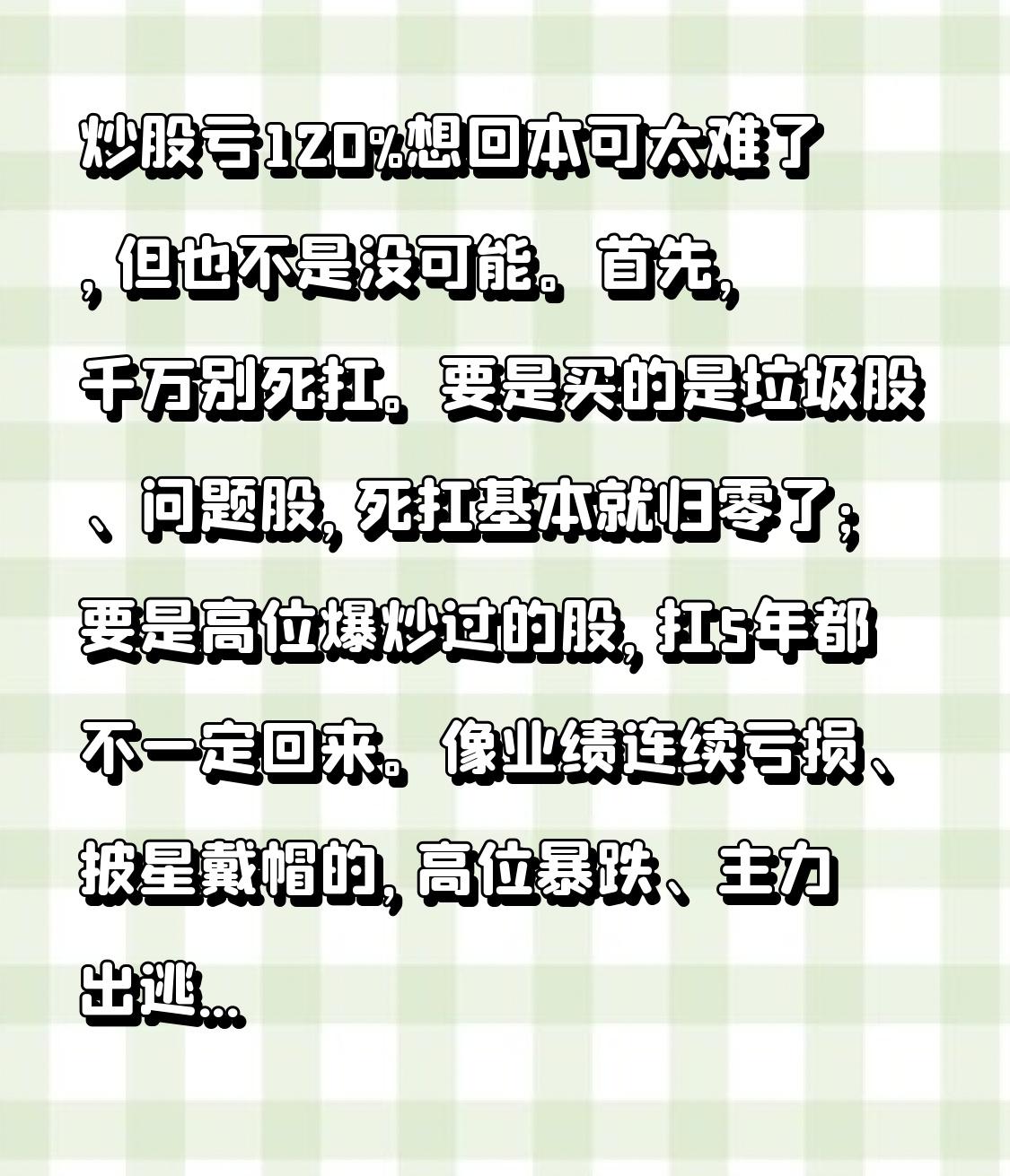 首先,千万别死扛。要是买的是垃圾股、问题股,死扛基本就归零了;要是高位爆炒过的股,扛5年都不一定回来。像业绩连续亏损、披星戴帽的,高位暴跌、主力出逃的,行业被淘汰的,都不能死扛。