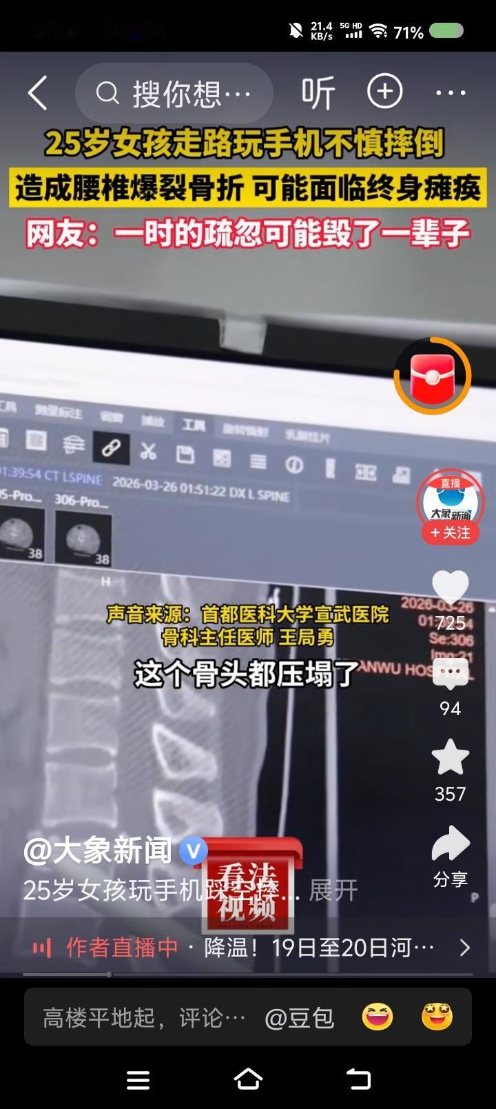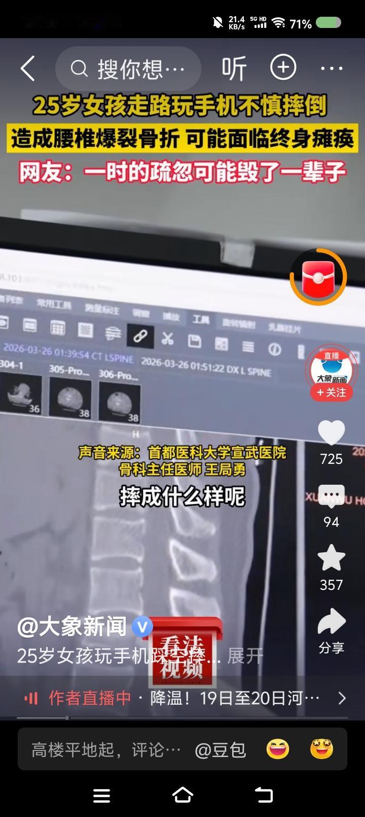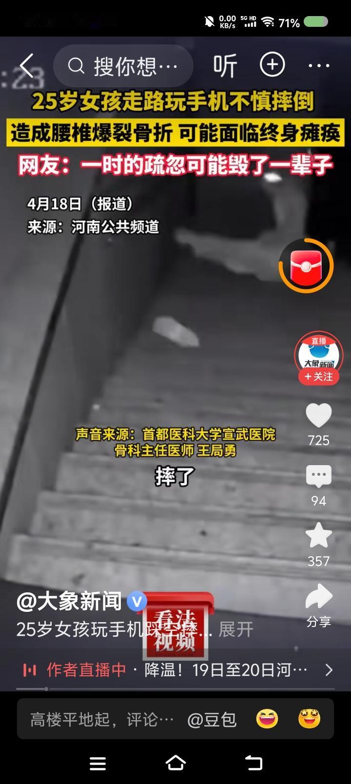 据报道,一女子下楼梯时看手机,踩空,摔了,重伤。