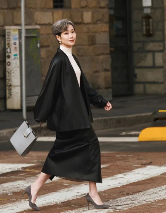 经典的小羊皮质地,给人静谧大气的质感,配上修身高腰半裙,更是提升了整体时髦度,简直就是行走的衣架子嘛。