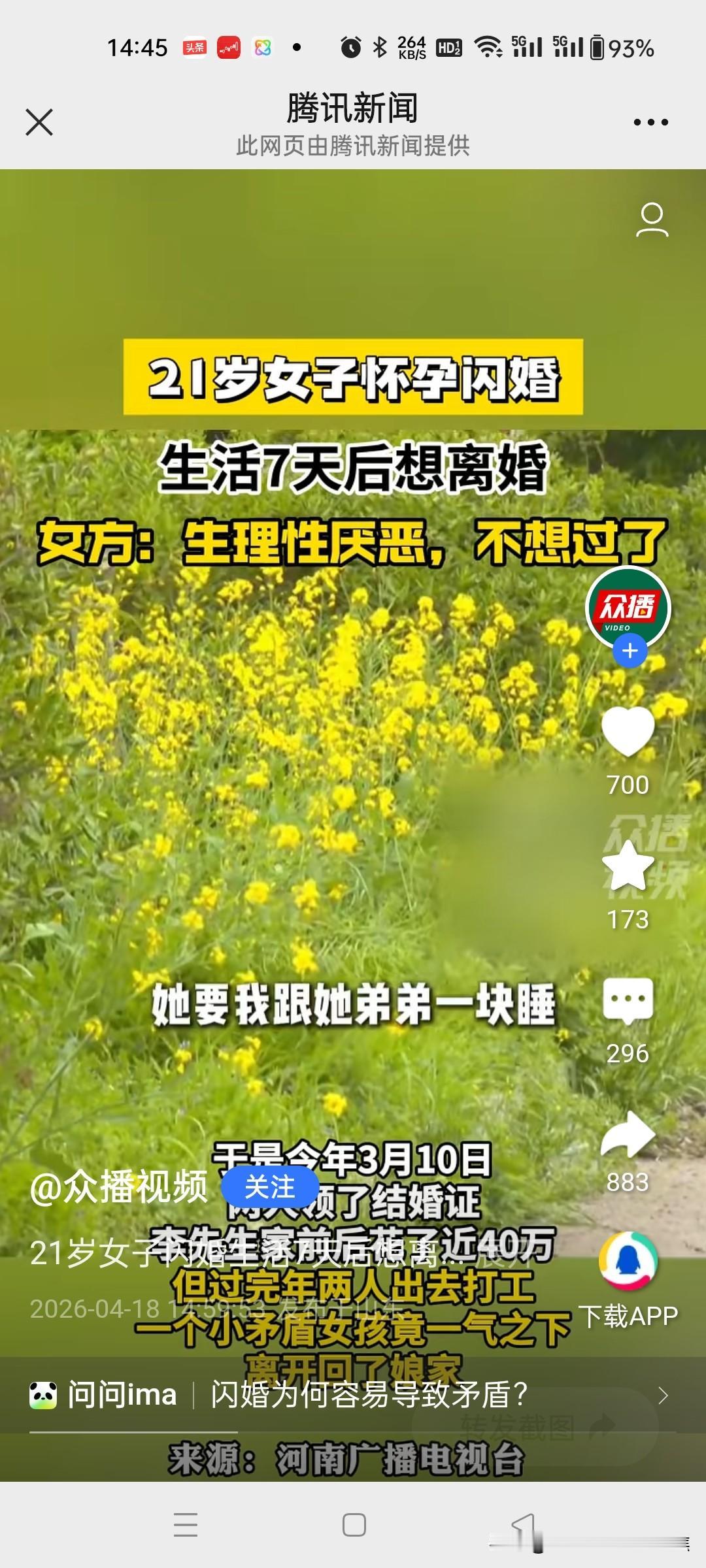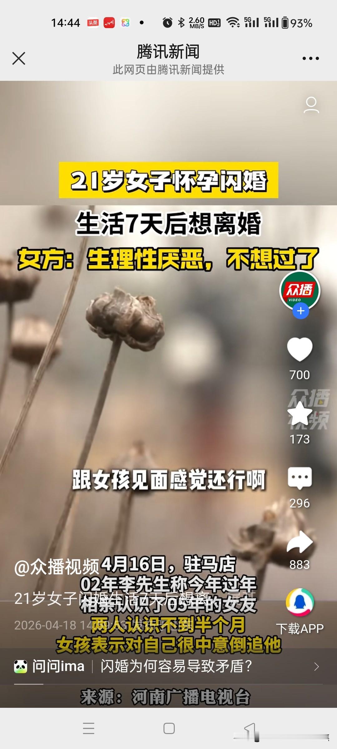 河南驻马店有一对00后情侣,相识不到半个月就闪婚,男方家庭为此支出彩礼等费用近40万元。3月10日领结婚证后,两人仅共同生活7天,女方便以“性格不合”及“生理性厌恶”为由回了娘家,还提出离婚。之后女方告知已怀孕,男方却对胎儿亲子关系存疑,称“孩子不知道是不是我的”,双方陷入僵局,调解无果。