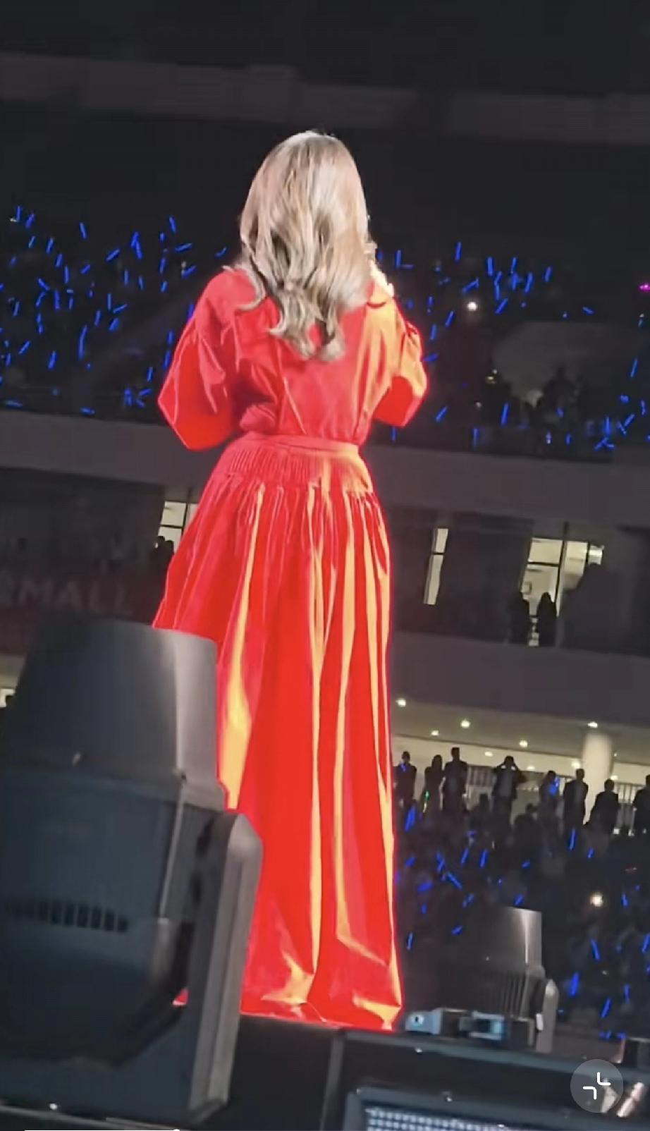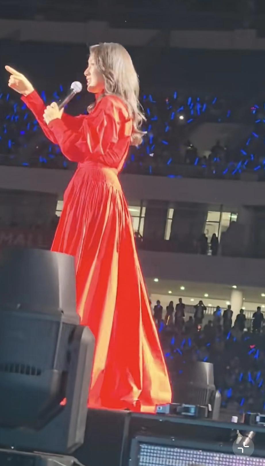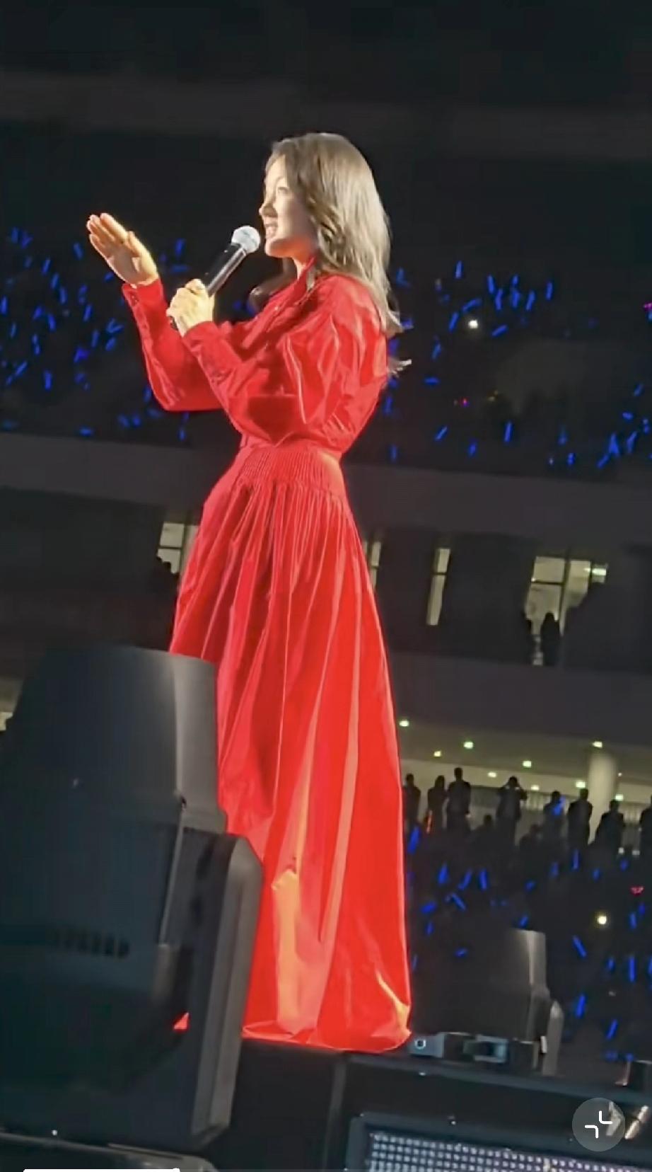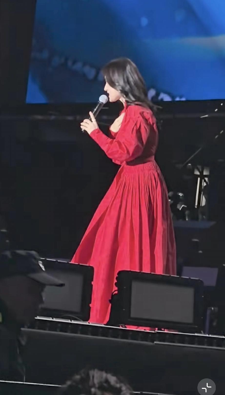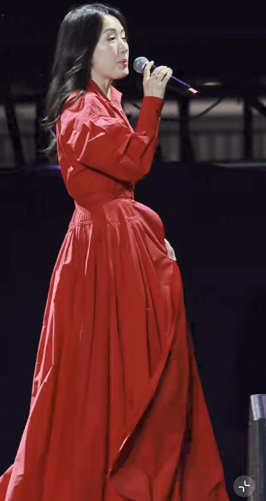 这次杨钰莹提前到达济宁,为了登台表演穿得特别喜庆,穿了一件大红色的束腰长裙子,裙子是蓬松的。