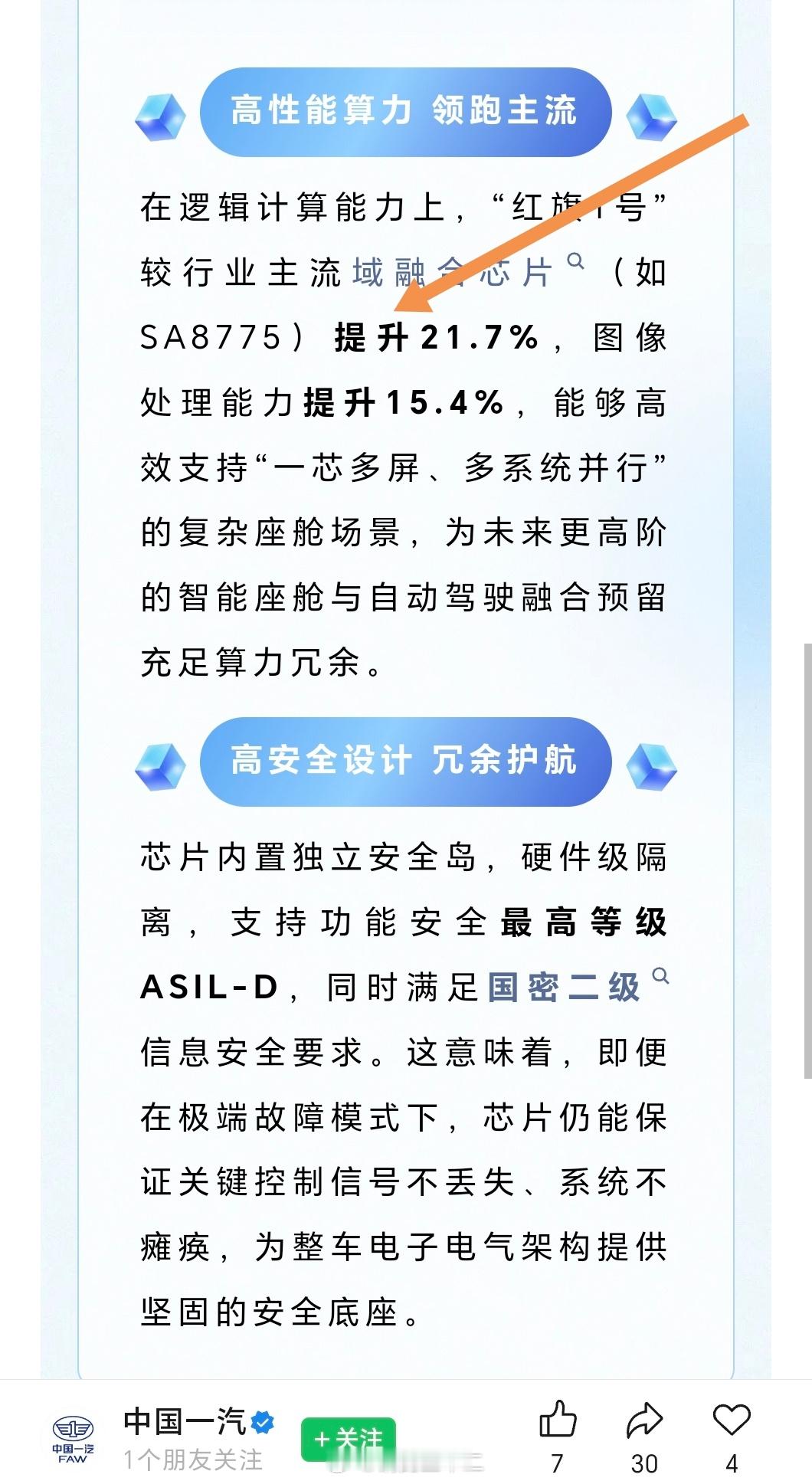 1、红旗前几天发了一个自研多任务芯片,红旗1号,可以简称为红旗H1。2、红旗1号是跟中兴合作研发的,据说是5nm芯片。3、算力与功能上对标高通主流产品,大概86tops,比部分车企的500tops的芯片当然是比不了,不过这也挺好了,毕竟这是一汽。。。4、红旗+华为的思路,其实已经错过了最佳的品牌打造时机,现在再合作,收益率要比两三年前低的多得多,本来出一个红旗品牌的奥迪替代品,多好?