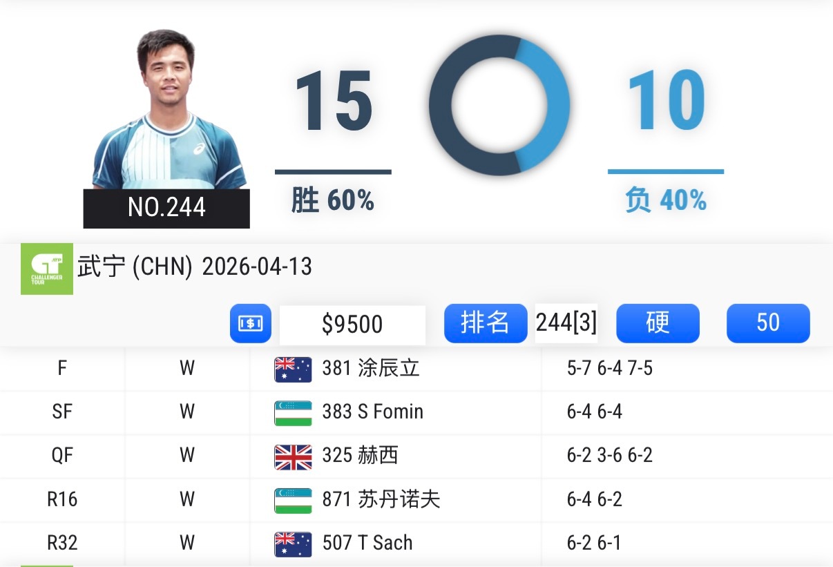 ATP武宁挑战赛,孙发京连胜五场,拿下个人挑战赛第二冠,即时排名升至No.213