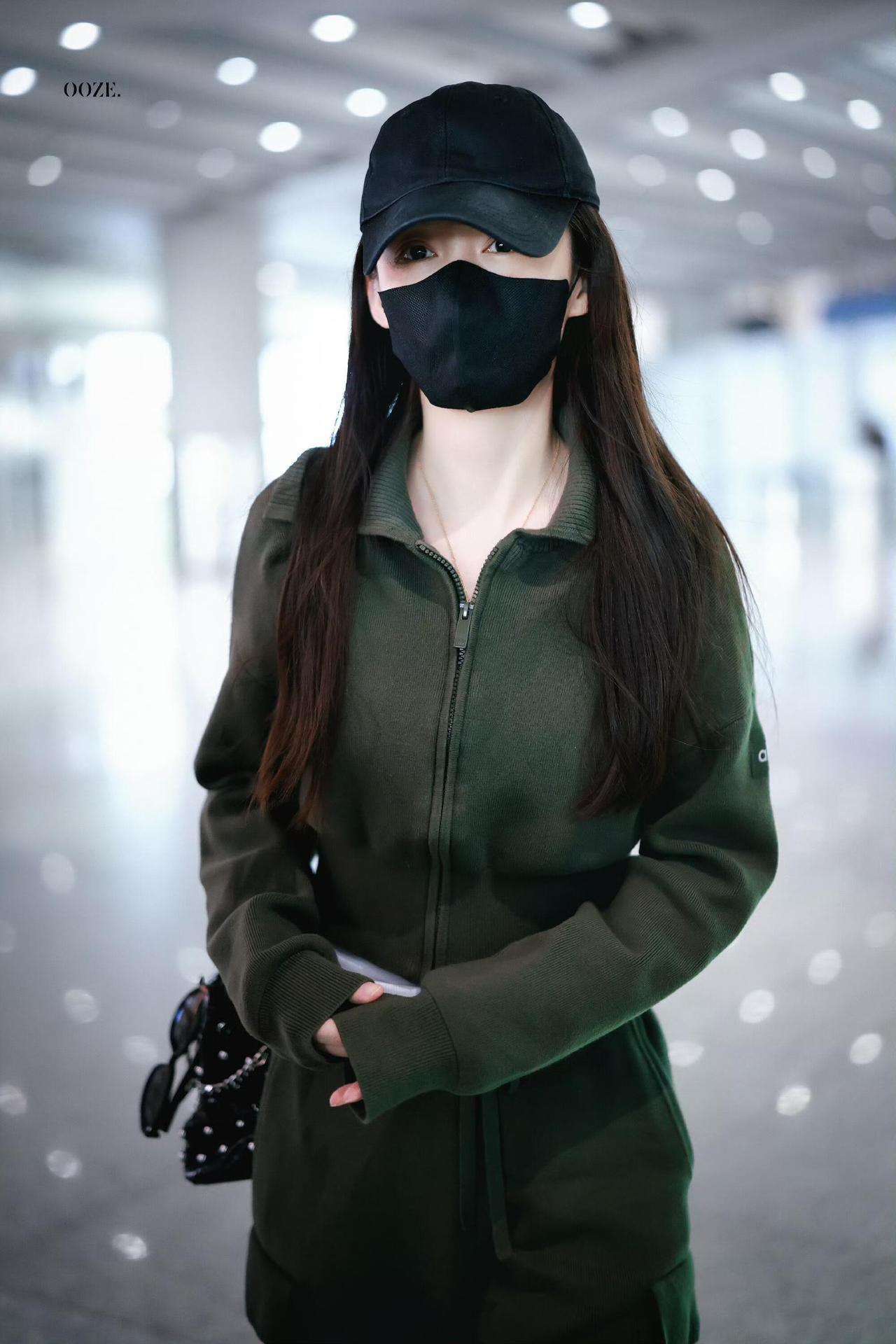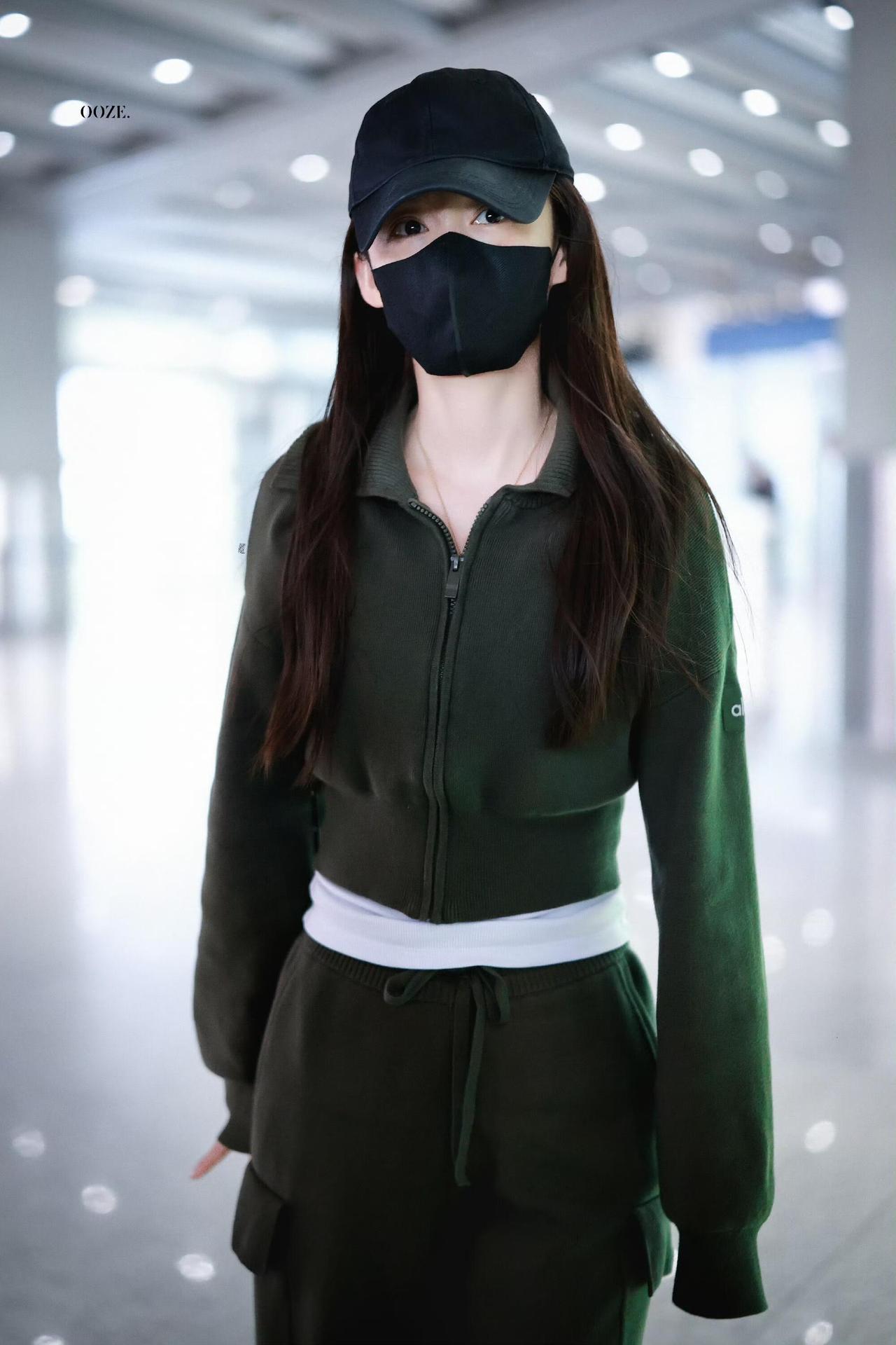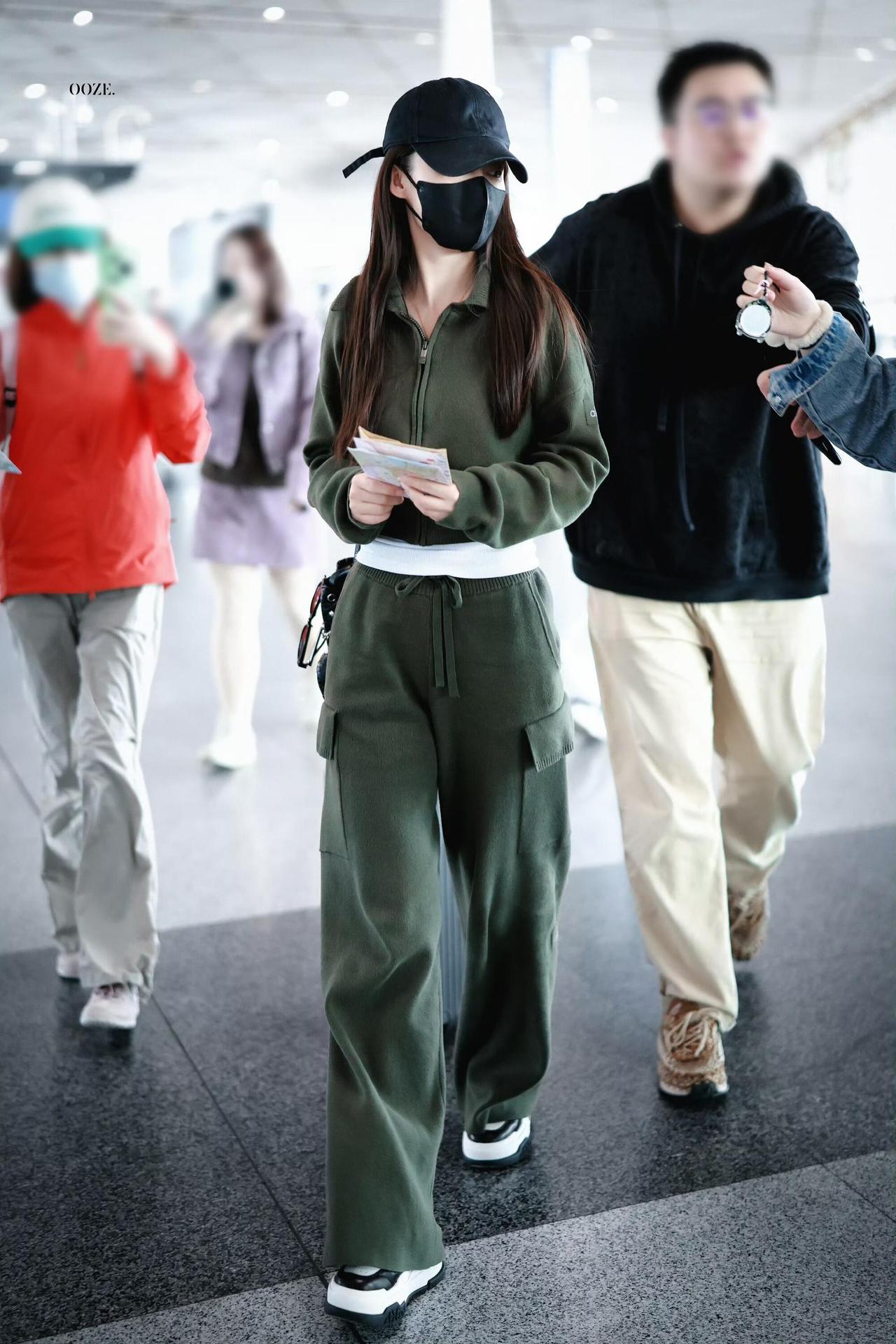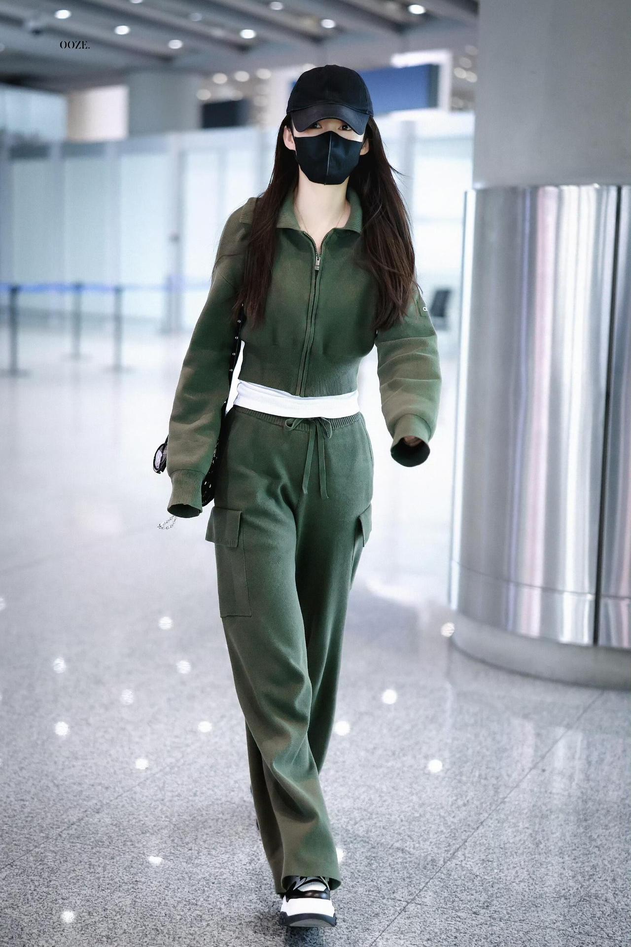 李沁街拍,一身军绿色很帅气! 短款拉链外套+工装阔腿裤套装,利落又显比例,露腰内